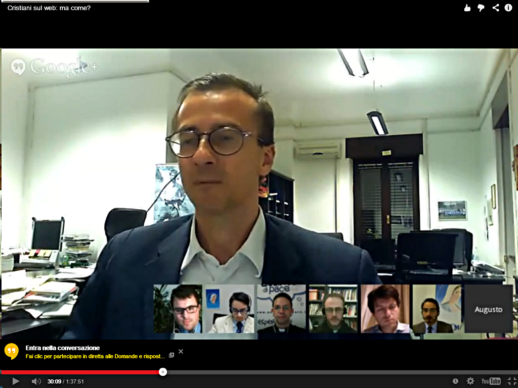 Da Padova don Marco Sanavio, direttore dell’Ufficio comunicazioni sociali di quella diocesi, ha raccontato i segreti del successo della proposta di “Un Attimo di Pace”, esperimento di pastorale mista in cui accanto a messaggi e contenuti trasmessi sul web, vengono proposte occasioni di incontro e di spiritualità. Alla diretta ha preso parte anche don Giovanni Benvenuto, parroco di Spirito Santo a Genova, fondatore di Qumran2.net, il più grande archivio italiano di materiali per la pastorale: “Qumran è nato per mettere in circolo materiali che tutti potevano produrre e consultare”. Daniele Trenca e Stefano Chiappalone della World Family of Radio Maria, che riunisce le Radio Maria di tutto il mondo, hanno spiegato come il web abbia dato nuova linfa a un mezzo tradizionale come la radio, sia grazie ai Social Network che alla diffusione in streaming.