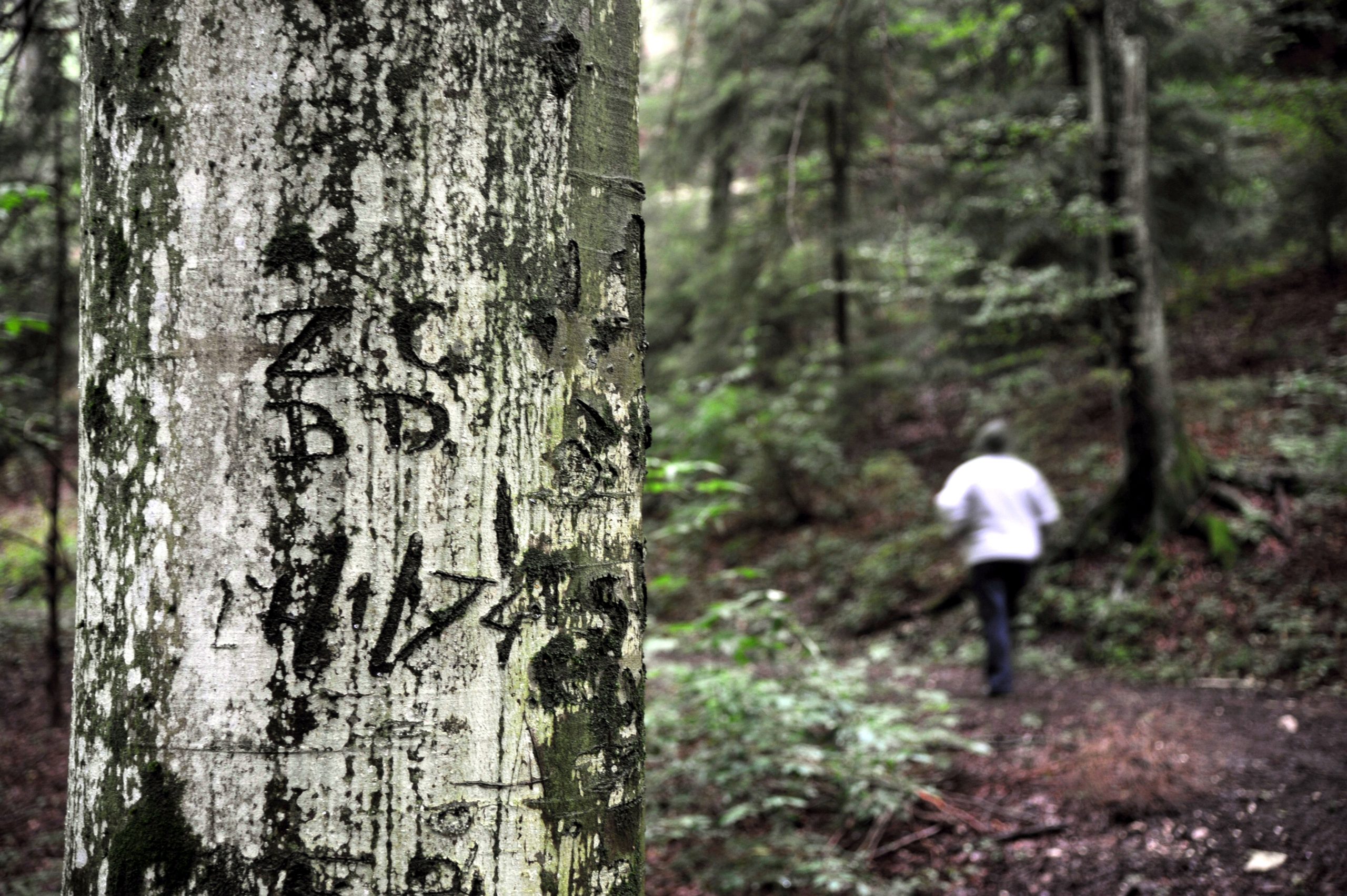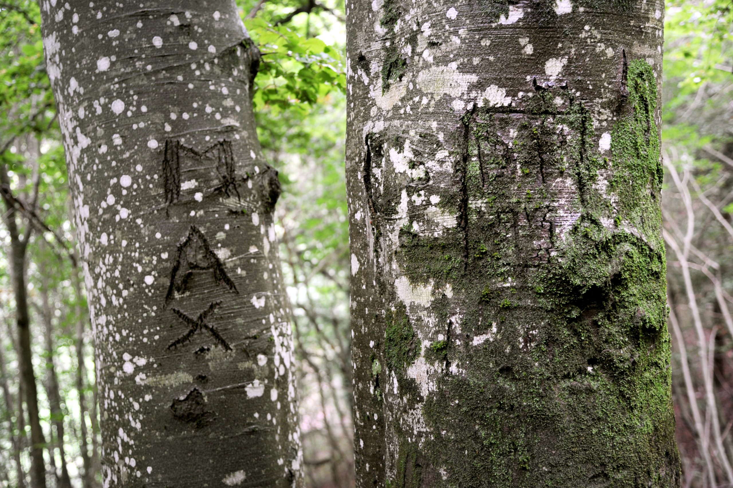 Nei pressi del lago di Cei è tutto un fiorire di messaggi incisi sui tronchi