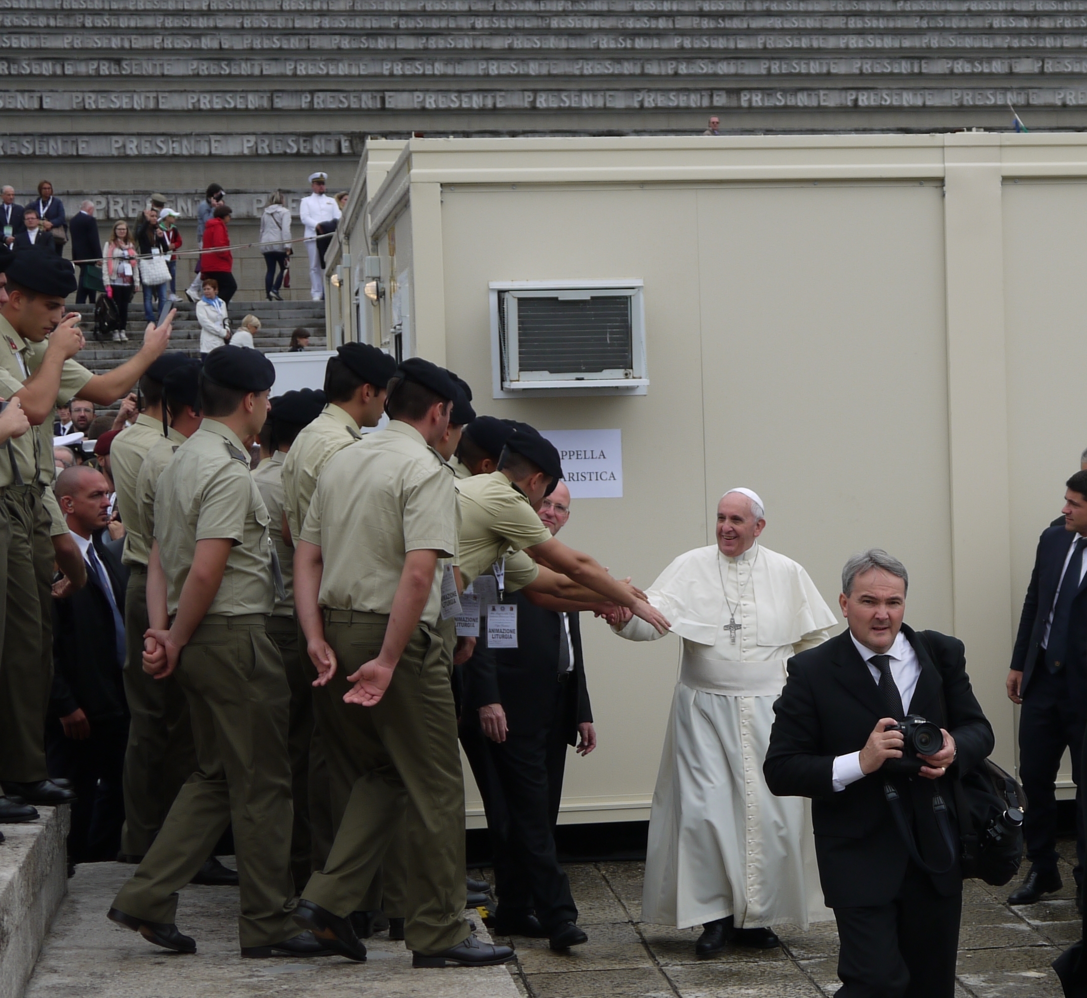 “A me che importa?” è l'interrogativo posto ripetutamente da Francesco alla Messa. In dono un altare da campo e l'attestazione del nonno Giovanni, combattente con i bersaglieri nella Grande Guerra