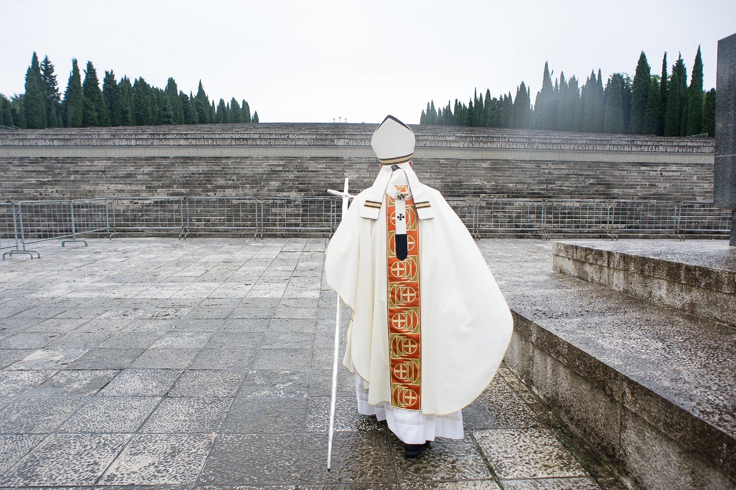Per rendere più efficace la sua riflessione Francesco aveva parlato dell'ambiente rurale attraversato dall'aeroporto di Ronchi dei Legionari a Redipuglia, flagellato dalla pioggia in quelle ore, ma ricco di campi coltivati, che gli ha consentito di contemplare la “bellezza del paesaggio”, dove uomini e donne lavorano portando avanti la loro famiglia, “dove i bambini giocano e gli anziani sognano”, un paesaggio solo apparentemente bucolico in stridente contrapposizione con le due aree riservate ai caduti nella Grande Guerra. Il cimitero austroungarico e il sacrario di Redipuglia con oltre centomila soldati caduti al fronte. Ha raggiunto il primo con pochi accompagnatori per pregare in silenzio e deporre un fiore su una tomba anonima.