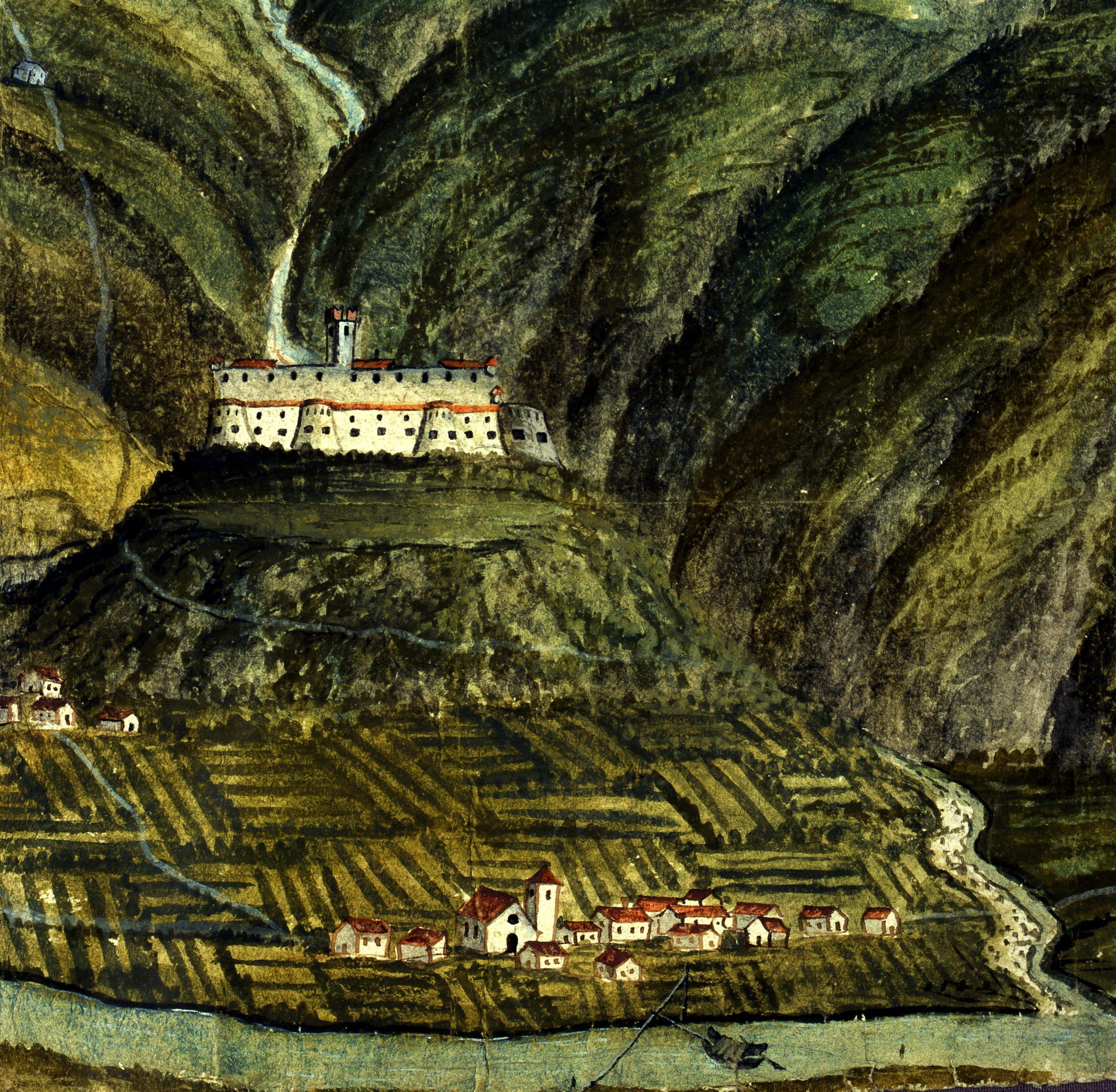 Questo quadretto seicentesco, inedito, di collezione privata, ritrae da ovest castel Beseno, alto su Beseno e su Calliano, nel suo aspetto migliore. Sull’Adige, più o meno dove i veneziani avevano costruito il ponte di barche, un traghetto per l’attraversamento civile del fiume. A sud (a destra) il rio Cavallo, dal quale non scendono miliziani e lanzichenecchi, ma fresche acque e cascatelle. Parafrasando De André, vien da dire che lungo le sponde dei nostri torrenti vogliamo che scendano trote argentate, non più i cadaveri dei soldati portati in braccio dalla corrente.