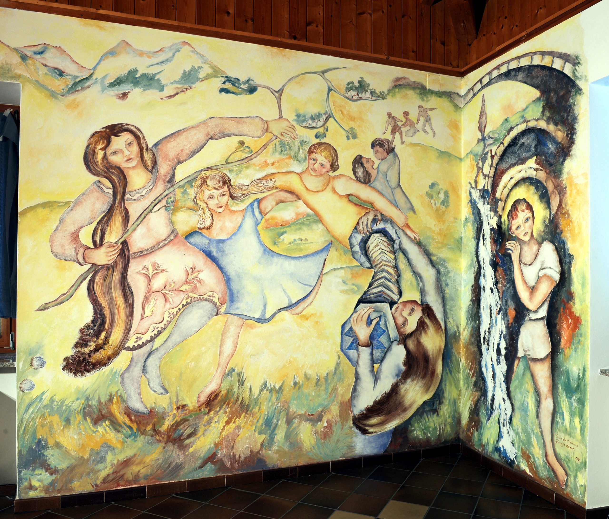 A Cavedago ha decorato la sala consiliare del Municipio con le immagini di un festoso gruppetto di ragazze e ragazzi danzanti, scalzi, i capelli al vento, le gonne svolazzanti, una di loro con una piccola fisarmonica, un organetto.