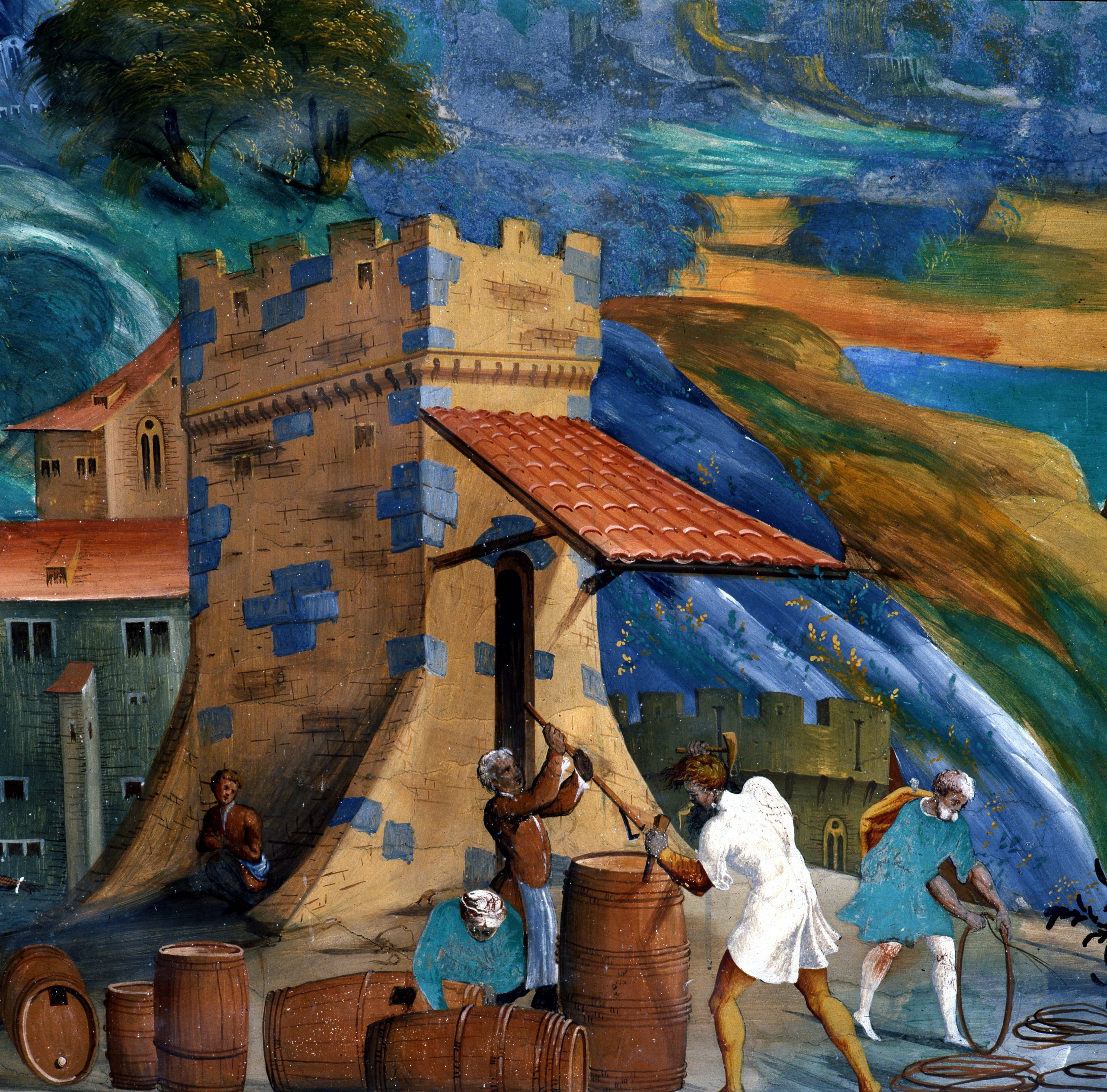 Alle spalle della torre che domina la raffigurazione una cascata suggerisce quanto la forza idraulica fosse assai importante anche per l’attività del fabbro e del bottaio.
