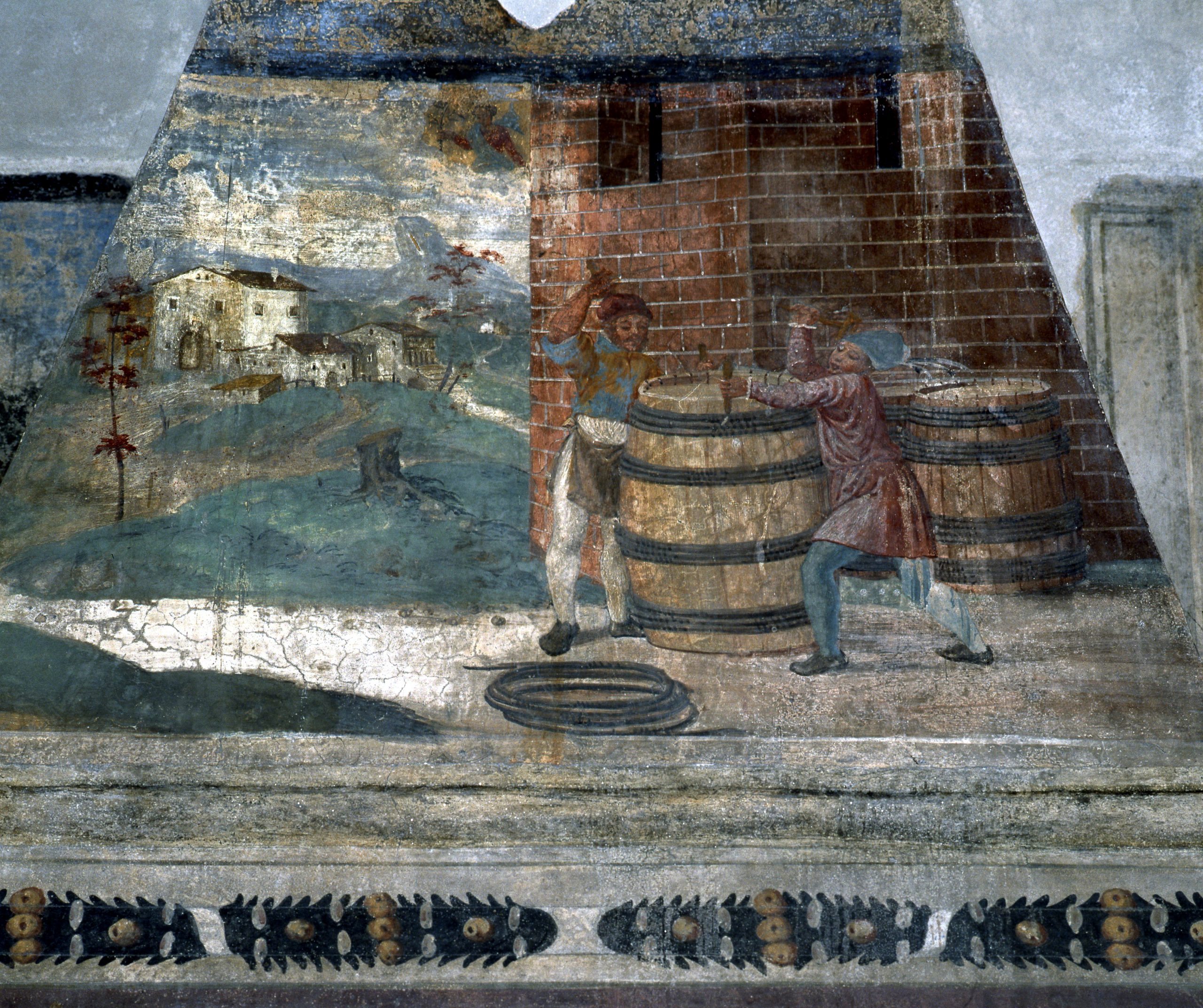 Proprio su questo riquadro, in basso, con tratto molto corsivo, una mano amica ha graffito il ricordo che “Adj 13 di questo (mese di agosto, ma appunto non serviva scriverlo perché la presenza del bottaio al lavoro connotava senza possibilità di fraintendimento trattarsi proprio di quel mese, ndr) del 1566 nacque il primo figlio a messer jsepo con nome Lorenzo”: Giuseppe Basso, allora il padrone di casa.