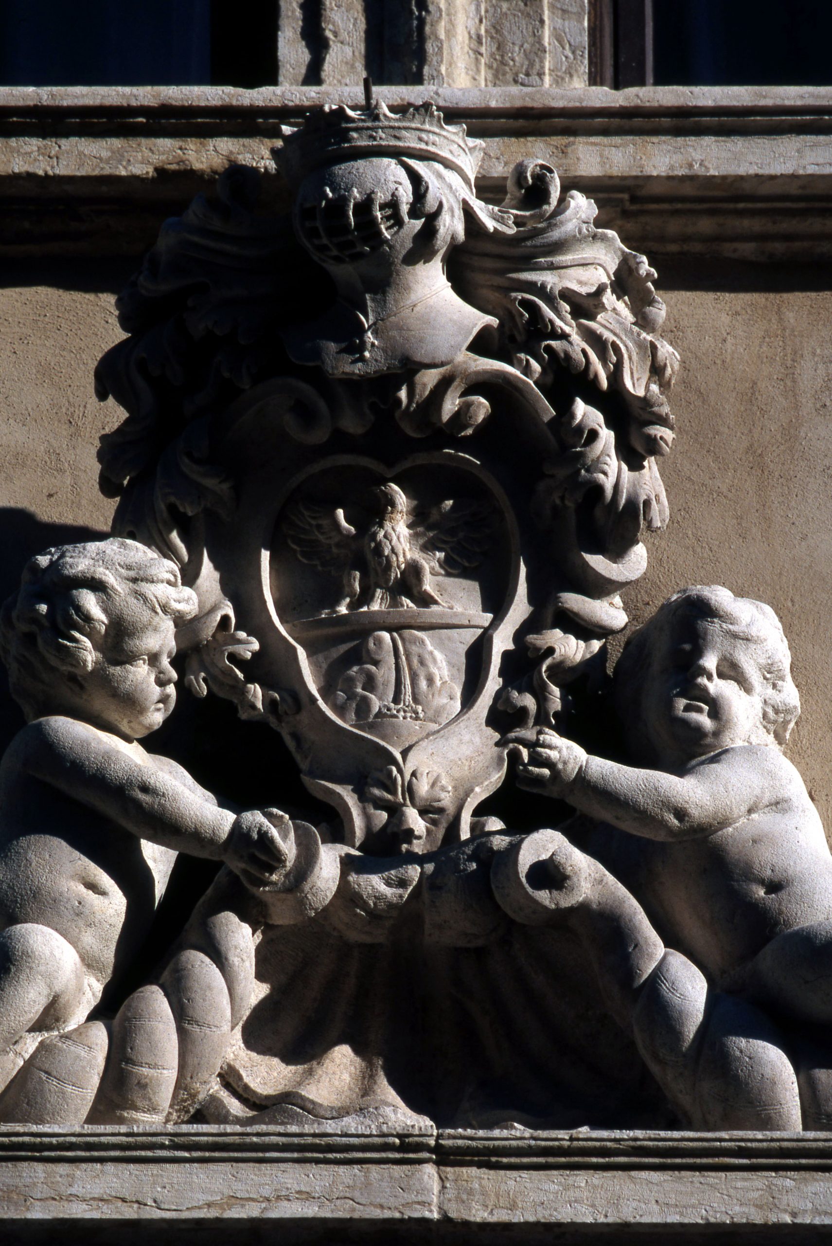 Tale stemma lo troviamo, grande, ben conservato, sorretto da due putti, sopra al portale di accesso all’imponente palazzo Sardagna in via Calepina 14 a Trento. L’edificio, eretto nel Cinquecento e ristrutturato nella prima metà del Settecento dalla potente famiglia, ha così assunto l’aspetto attuale di architettura di transizione tra quella rinascimentale e quella barocca.