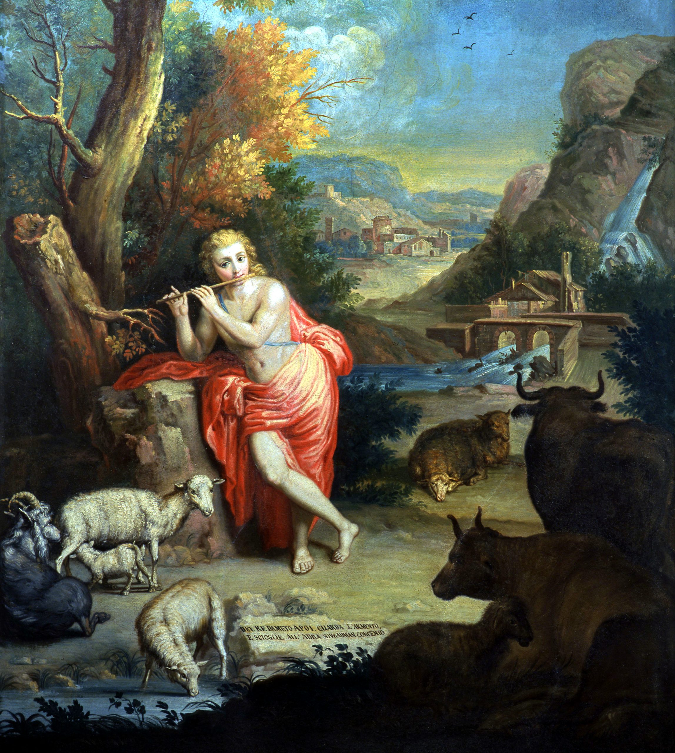 Mollemente appoggiato ad una grande pietra, suona un semplice flauto traverso di legno ricavandone una musica armoniosa della quale è il primo, e l’unico, a bearsi: con lui sono solo una decina di capre, pecore, agnelli e mucche, alti nel cielo quattro uccelli. Biondo, dall’aspetto assai giovanile, drappeggiato all’antica con un achiton di uno squillante rosso aranciato, è inserito entro uno spazioso paesaggio agreste d’una natura immobile, quasi sospesa in un indefinito non tempo.