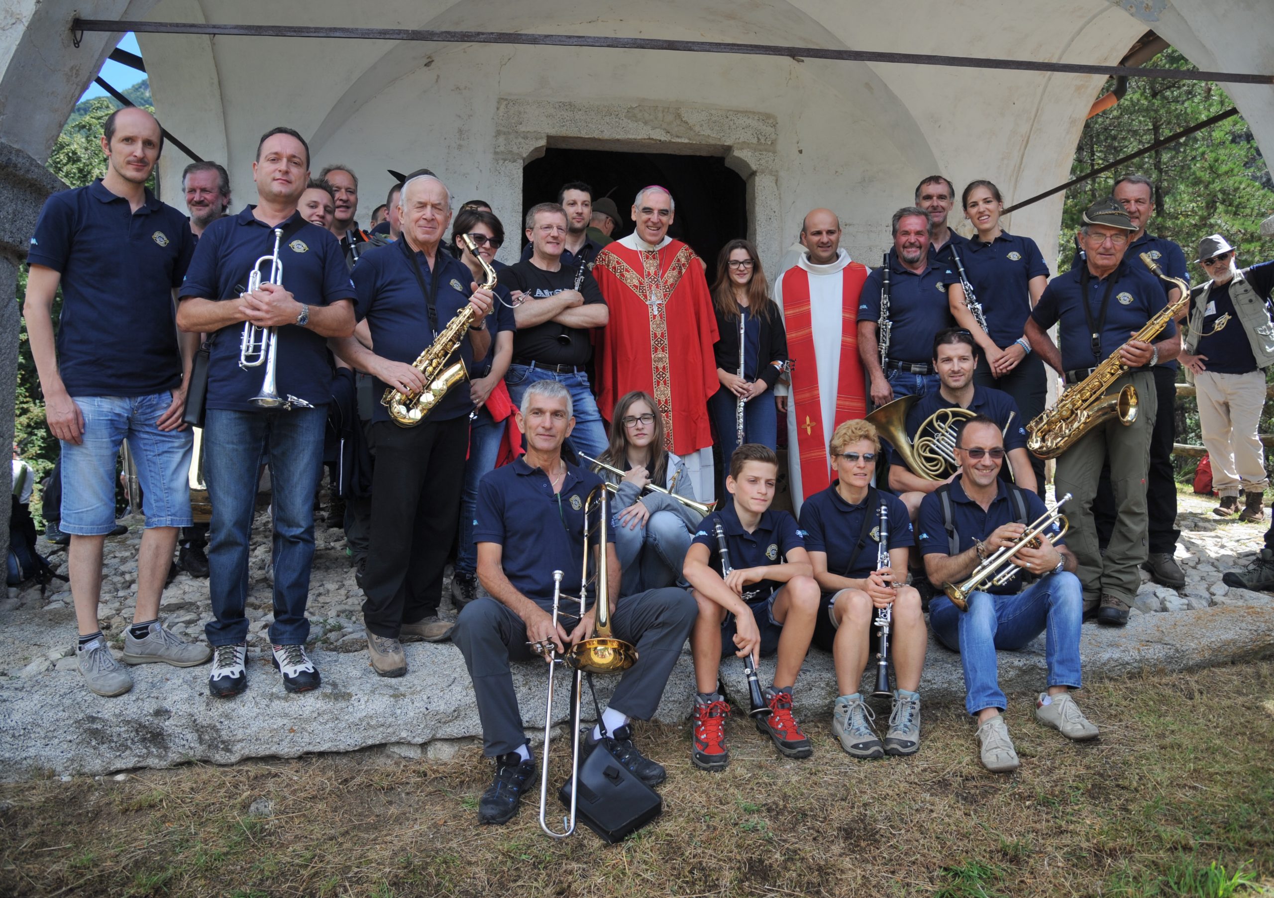 E veramente è stata ancora festa grande, col vescovo a parlare e farsi fotografare con tutti, accompagnato della bella musica suonata dal Corpo bandistico di Condino “G. Verdi” e quindi parte del pranzo comunitario preparato dagli alpini a base di polenta carbonera e buon vino, e di tanti canti che si sono protratti fino a sera.