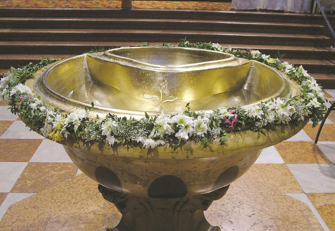 Parliamo dell'intervento di restauro del fonte battesimale e, prima ancora, delle pile dell'acqua benedetta, quelle dove i fedeli intingono la mano e con il segno della croce fanno0 memoria del proprio battesimo.
