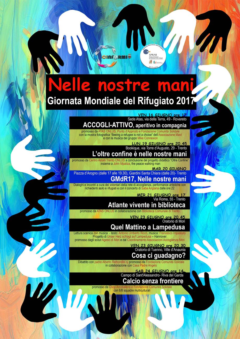 Anche a Trento, tra il 16 e il 24 giugno, è in programma una serie di eventi, pensati dalla rete di enti per l'accoglienza dei richiedenti asilo ospiti in Trentino. Filo conduttore delle varie iniziative è il ruolo del volontariato, il vero ponte tra chi arriva e la società civile, il territorio e le comunità ospitanti. Il titolo: "Nelle nostre mani" si riferisce proprio a questo: il futuro tocca a tutti noi, nessuno escluso. Per questo si è scelto di essere in piazza accanto a chi passeggia per un gelato e a chi è a Trento in attesa della chiamata in Commissione per il riconoscimento della protezione internazionale.