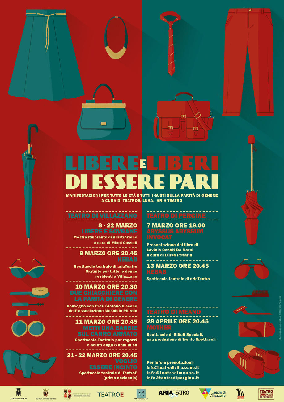 Ha preso il via il 7 e proseguirà fino al 28 aprile “Libere e liberi di essere pari”, una manifestazione culturale che mette al centro il tema della parità di genere trattandolo attraverso varie forme artistiche e diffondendosi su un territorio ampio. La manifestazione si dividerà infatti tra i teatri di Villazzano, Pergine e Meano.