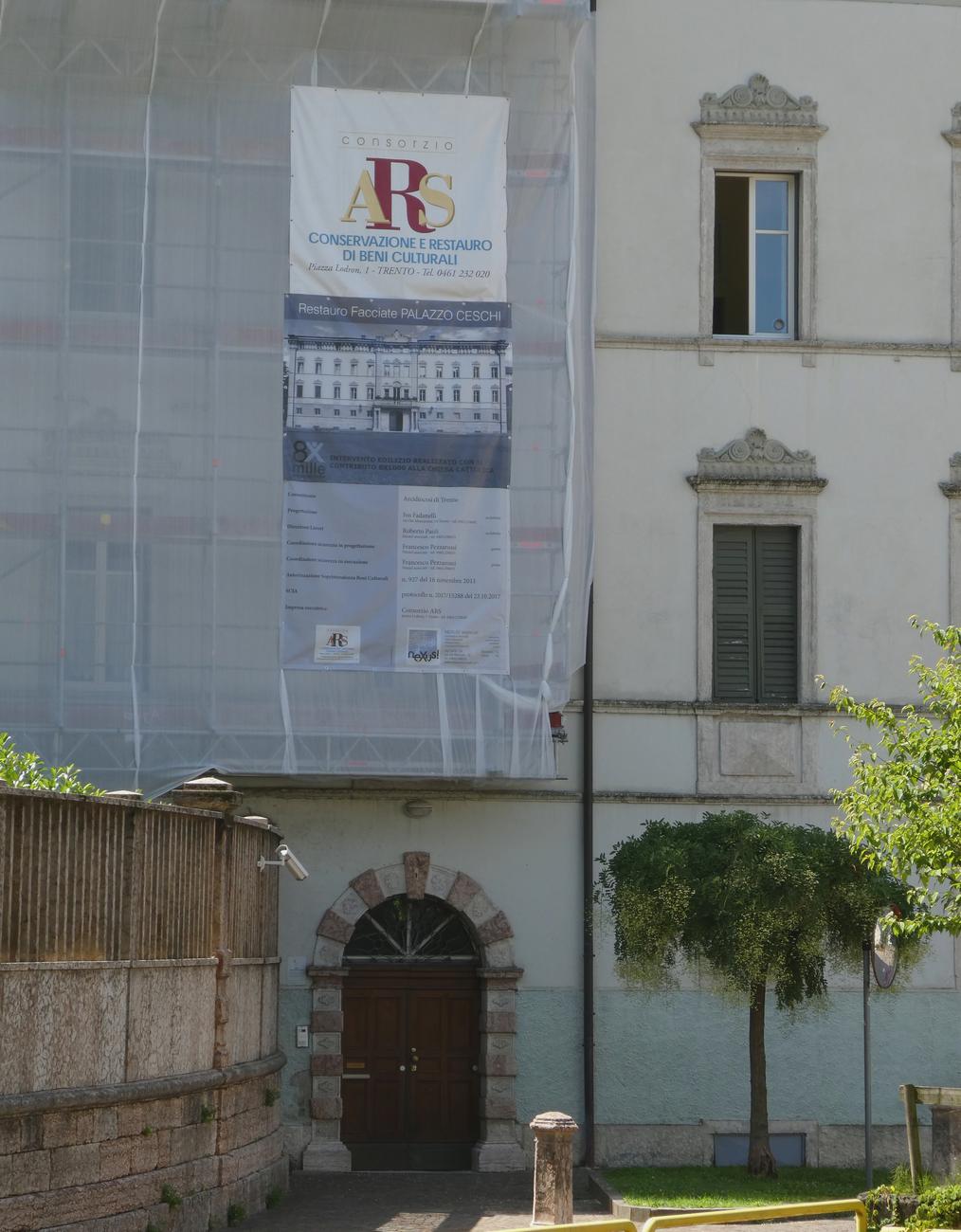 Con i primi di settembre interessano il lato sud di piazza Fiera i lavori di restauro delle facciate di palazzo Ceschi, l'edificio che ospita dal 1922 l'episcopio e gli uffici dell'Arcidiocesi, noto fra i trentini come il “palazzo di Curia”. L'intervento – come anticipato a inizio cantiere nella – riguarda tutte le facciate dell’edificio, ricostruito in stile neorinascimentale tra il 1872 e il 1873 dai fratelli Ceschi di Santa Croce su progetto dell'architetto Ignazio Liberi che reimpiegò il portale dell'edificio preesistente. Da quest'ingresso si risale idealmente in retrospettiva storica fino alla fine del Cinquecento con il palazzo della famiglia Peregrini, ceduto nel 1633 al principe vescovo Carlo Emanuele Madruzzo e, appena 7 anni dopo, alla famiglia Particella: dai fratelli Lodovico e Vincenzo passò poi ai nipoti Giuseppe e Ginevra; fu lasciato in donazione all'Istituto dei sordomuti che lo vendette nel 1871 ai fratelli Luigi e Giovanni Battista, i baroni Ceschi.