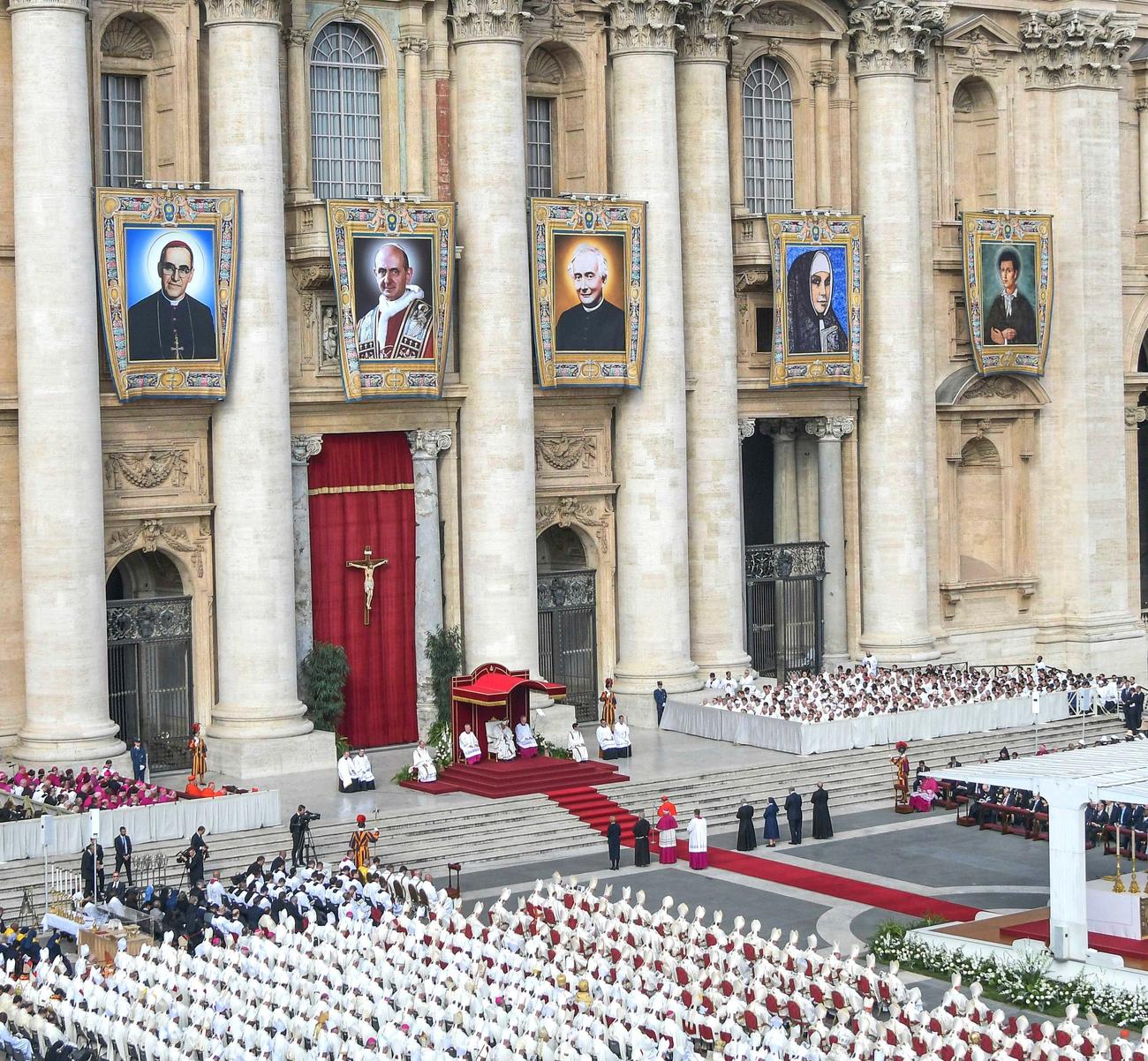 Davanti a 70mila persone che affollavano Piazza San Pietro, domenica 15 ottobre Papa Francesco ha procalmato santi Paolo VI, il Papa della sua formazione, quello più citato nei suoi documenti, Oscar Arnulfo Romero, il vescovo di San Salvador martirizzato il 24 marzo 1980 dagli “squadroni della morte”, Francesco Spinelli, Vincenzo Romano, Maria Caterina Kasper, Nazaria Ignazia di Santa Teresa di Gesù e Nunzio Sulprizio.