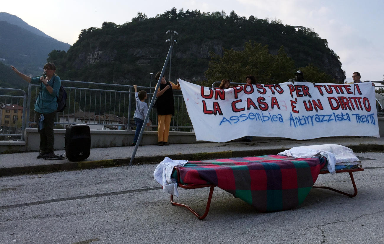 Nella città Trento esistono edifici pubblici e privati sfitti da anni, mentre solo nel 2018 più di mille persone – 1220, per l’esattezza, dicono i dati dello Sportello unico per l’accoglienza – si sono rivolte ai dormitori di Trento e di Rovereto per avere un posto letto. Persone migranti, ma anche cittadini italiani, che a motivo della crisi economica sono scivolati sempre più giù fino a non potersi più permettere di pagare un affitto, nonostante un lavoro, magari precario, ce l’abbiano. Per denunciare la situazione dei senza dimora, l’Assemblea Antirazzista Trento ha promosso una manifestazione, sabato scorso 28 settembre, che ha toccato alcuni luoghi significativi della città, edifici sfitti e abbandonati di proprietà pubblica. Ad ogni tappa, accompagnata dalle note della Raccatum Band, che coinvolge le persone senza dimora attraverso l’uso della musica, veniva aperto un letto-brandina per rendere visivo il bisogno di un posto per una momentanea tregua dalla durezza della vita in strada. Sono stati così raggiunti di volta in volta edifici come l’ex Provveditorato in via Santa Margherita, da dove il piccolo corteo è partito nel pomeriggio, o l’ex ostello della gioventù di via Manzoni, per finire con l’ex hotel Panorama, che da Sardagna domina la città, chiuso dal 2012 dopo essere stato utilizzato per alcuni anni dall’Università e oggi di proprietà di Patrimonio del Trentino. I promotori dell’iniziativa “Un posto per tutti/e” chiedono all’amministrazione comunale di Trento e alla Provincia autonoma che per questi spazi si immagini una nuova vita, in risposta a bisogni sociali nuovi, complessi, urgenti, visto anche l’arrivo della stagione fredda. Senza aspettare “l’ennesimo intervento speculativo che li trasformi in spazi commerciali, turistici o residenziali a sostegno della rendita immobiliare, preclusi a chi ne ha realmente necessità”. Una proposta concreta, che sarà portata in consiglio comunale a Trento, è di realizzare in uno di questi edifici abbandonati un ostello per lavoratori a basso reddito, oggi esclusi dal mercato immobiliare e costretti a rivolgersi alle strutture pensate per chi proprio non ha reddito e vive sulla strada. Chi vuole sostenere la campagna di raccolta fondi “Un posto per tutti/e” può scrivere all’Assemblea Antirazzista: trentoantirazzista@gmail.com.