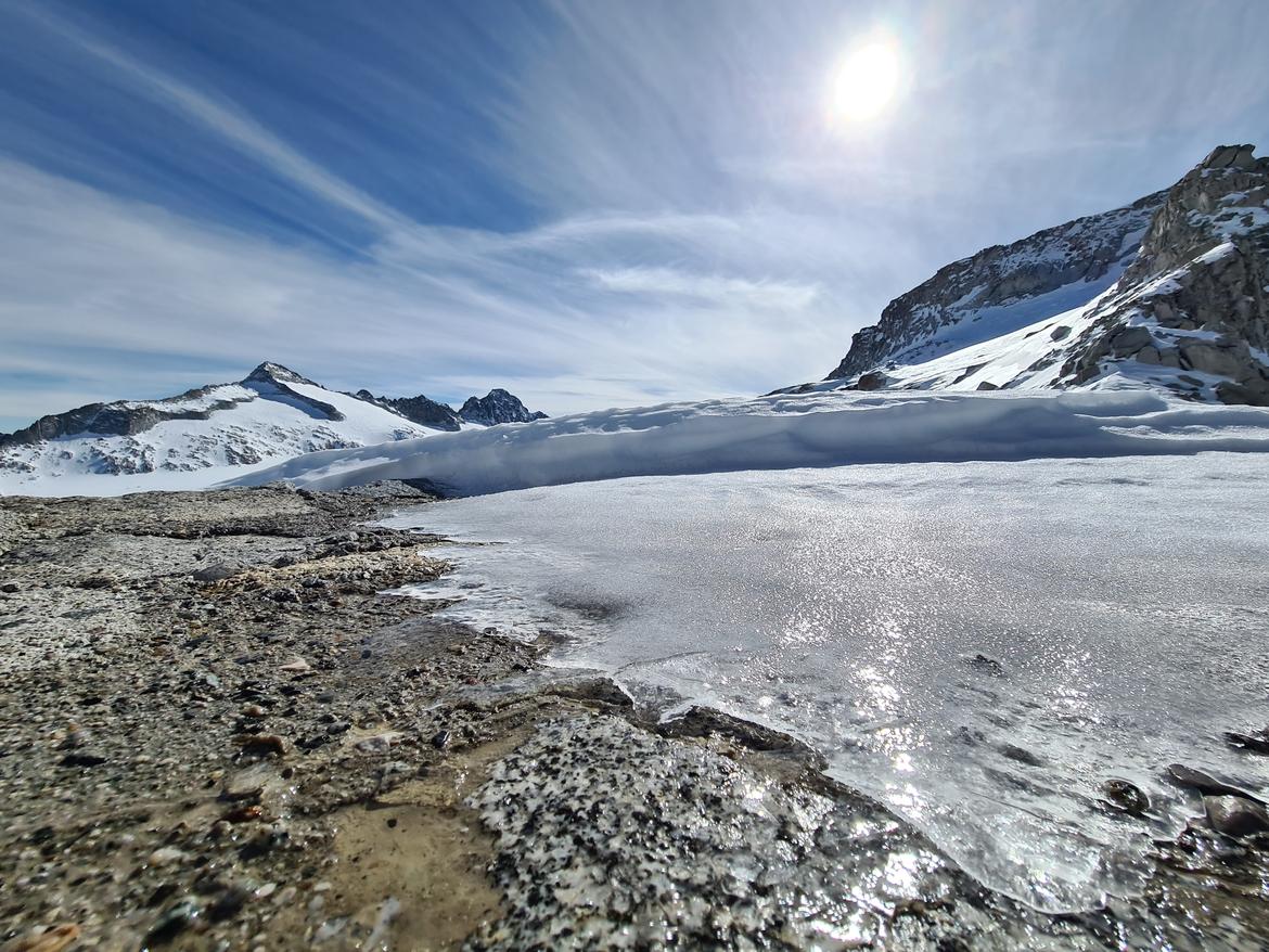 La scarsità della risorsa idrica nivale è stata confermata nel sopralluogo sul ghiacciaio del Mandrone (Adamello), compiuto dal direttore di Meteotrentino, Mauro Gaddo.