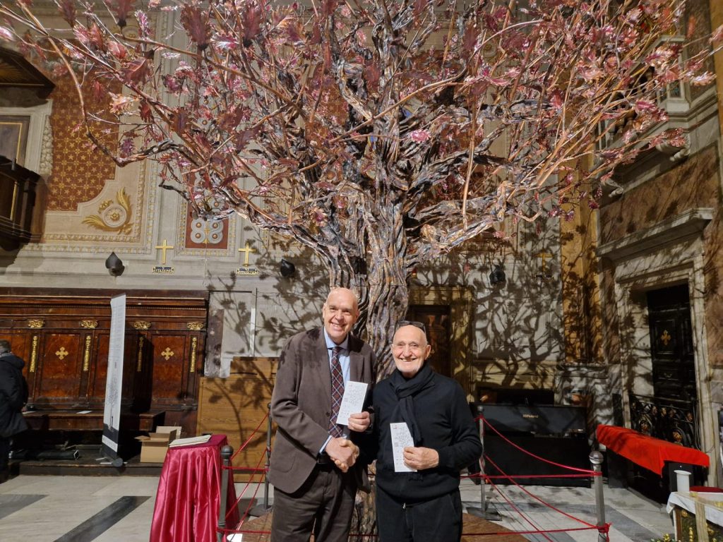 Domenica 8 dicembre si è tenuta a Roma, presso la chiesa del Caravita, l’inaugurazione dell’opera monumentale Quercia di Mamre, dell’artista e orafo trentino Settimo Tamanini, conosciuto come Mastro7. Si tratta di un albero alto sette metri realizzato in rame puro, cesellato e lavorato a fiamma, caratterizzata da un tronco possente e tre rami che si protendono verso il cielo. Un simbolo di accoglienza e unità che resterà esposto fino a gennaio 2026, accompagnando l’intero Giubileo intitolato “Pellegrini di Speranza”.