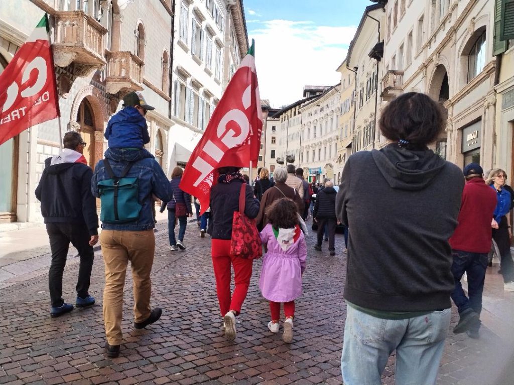 Il canto “Bella Ciao”, intonato dalla Corale Bella Ciao, ha fatto applaudire anche le persone che si sono affacciate alle finestre della piazzetta che porta il nome di un noto partigiano trentino: Mario Pasi.