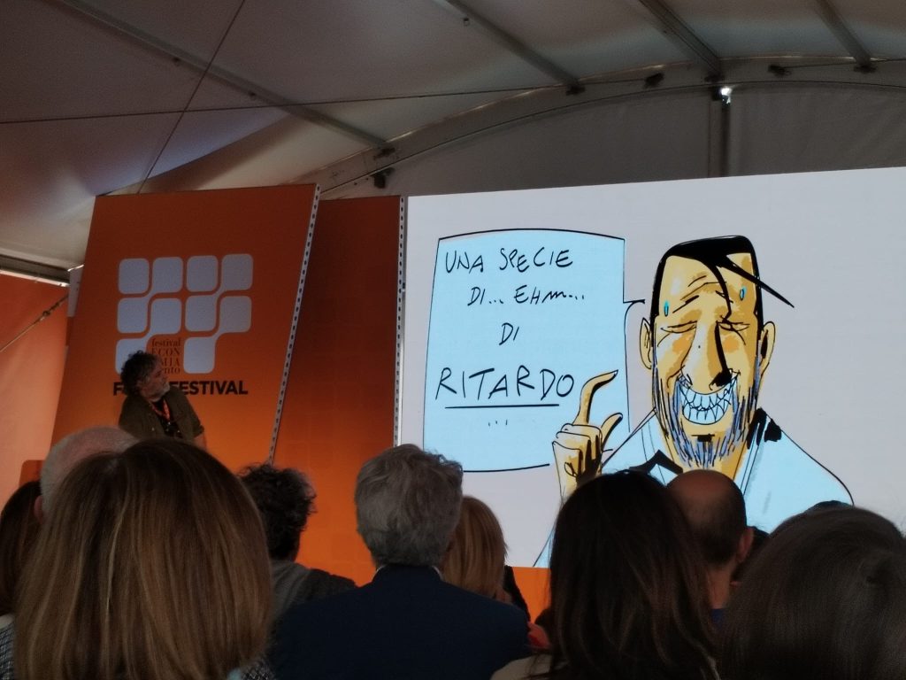 “La satira vera è quella veramente informata. Continuo a credere che la satira vera la fa chi si informa tantissimo”. Ha regalato i suoi cartoon al Festival dell’Economia di Trento Marco Dambrosio, in arte Makkox, invitato dallo studio d’arte Andromeda e protagonista del panel “Makkox: la satira al tempo dei social”, durante il quale ha dialogato con il giornalista Mauro Meazza. Tra i fumetti di Salvini che diventa ministro dei trasporti in Giappone, dove quando i treni arrivano con qualche minuto di ritardo viene aperta un’inchiesta, o che viene ritratto in un momento di pausa dal lavoro, mentre si addentra nel Ministero dell’Interno, il suo “vero amore”, Makkox ha parlato con il pubblico di come intende la satira: non come dissacrazione, ma come riconoscimento della persona nella sua umanità e nelle sue stranezze, che la rendono quasi simpatica e buffa. “A me viene naturale così. Tendo a voler riconoscere una componente umana, anche quella più aberrante, anche dove colgo l’essere umano che sbaglia. È una cosa che mi viene istintiva”, ha spiegato, raccontando che “quando disegnavo Berlusconi mi dicevano che lo facevo simpatico. Ma a me ricordava mio zio truffaldino, che tra l’altro viveva a Milano. Non conoscendo personalmente Berlusconi, ci buttavo dentro mio zio. Anche perché a me disegnare il mostro mi spaventa, non mi interessa”.