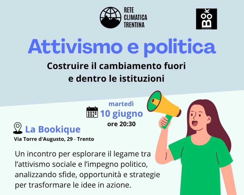Come costruire il cambiamento dentro e fuori le istituzioni? È questa la sfida a cui si tenterà di rispondere nella serata di martedì 10 giugno, alle 20.30 alla Bookique di via Torre d’Augusto 29, a Trento, durante l’incontro organizzato dalla Rete climatica trentina.