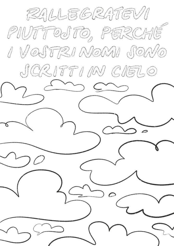 Che bello pensare che il nostro nome è già scritto in cielo: c’è già un posto per noi. Come quando arriviamo a scuola il primo giorno e sul banco le maestre hanno già preparato un foglietto col nostro nome.