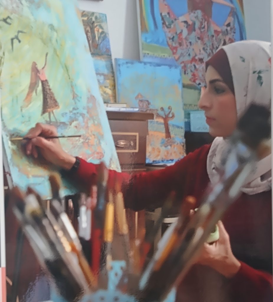 Dall’autunno 2023, quando il suo studio è stato bombardato, ha iniziato ad organizzare laboratori di pittura per bambini fra le macerie. Anche il marito, Mohammed, psicologo, lavora con i bambini sfollati in tende e campi allestiti nella zona. Con i loro tre figli, Salem 12 anni, Seba 10 e Ameera 8, vivono a Deir El-Balah, città palestinese collocata al centro della Striscia di Gaza.