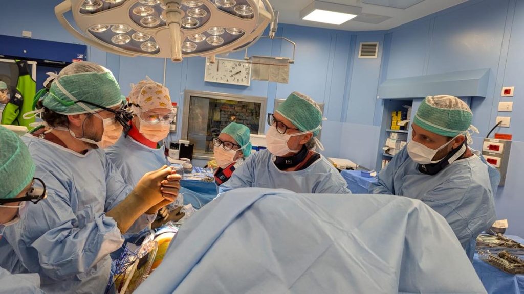 Il paziente è stato vittima di un incidente mentre stava falciando l’erba con una trinciatrice automatica: un frammento metallico lungo circa 7 centimetri lo ha colpito al torace, lesionando il polmone destro e perforando l’aorta toracica discendente. Una condizione estremamente critica, che senza un intervento immediato avrebbe avuto esiti fatali. Dopo il primo soccorso all’ospedale di Arco e gli esami diagnostici che hanno individuato la natura e la pericolosità della lesione, l’uomo è stato trasferito d’urgenza al Santa Chiara. Qui è stato immediatamente preso in carico dai cardiochirurghi, guidati dal professor Francesco Onorati, e dai chirurghi vascolari diretti dal dottor Stefano Bonvini, che hanno eseguito un intervento combinato e “ibrido” di salvataggio: la rara condizione – che un tempo sarebbe stata trattata con una sostituzione dell’aorta toracica discendente, certamente più invasiva – è stata invece curata “a quattro mani” dai medici della cardiochirurgia e della chirurgia vascolare, con un approccio “ibrido” con una fase cosiddetta “a cielo aperto”, per la rimozione del corpo estraneo, e una fase “endovascolare” di copertura della lacerazione aortica con endoprotesi, senza necessità di sostituire l’aorta e mantenendo il principio di mini-invasività.
