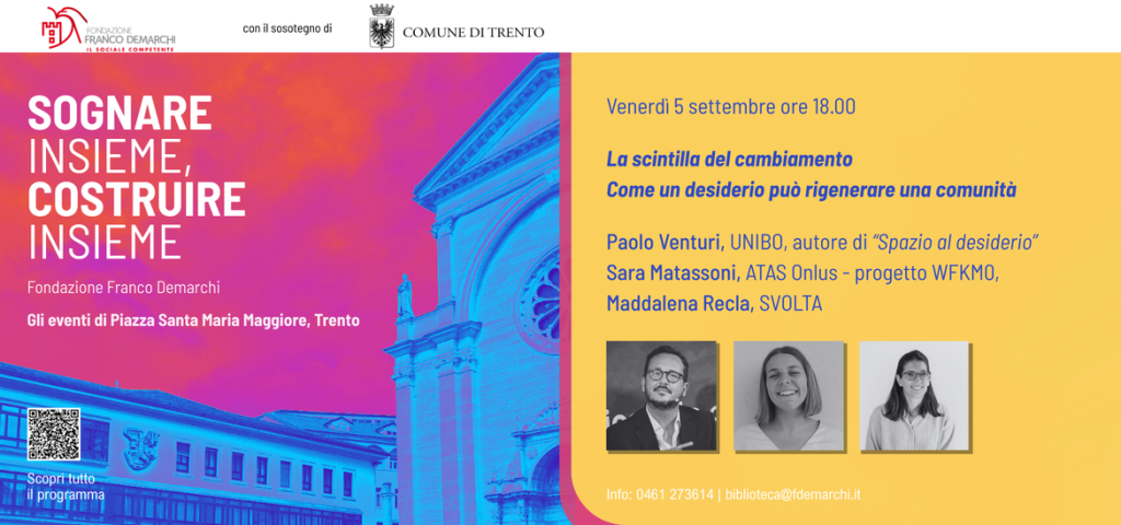 Riparte venerdì 5 settembre “Sognare insieme, costruire insieme”, la rassegna della Fondazione Franco Demarchi dedicata a storie, desideri e visioni per il futuro delle nostre comunità: un viaggio collettivo per riflettere e agire sul cambiamento sociale, dal potere rigenerativo dei desideri, alla capacità dell’arte di rendere accessibile la complessità, fino alla memoria culturale delle montagne e alla sostenibilità nelle piazze.
