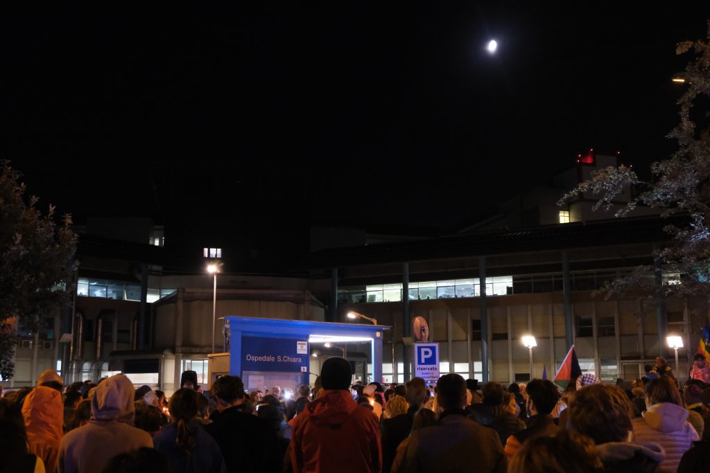 Hanno manifestato in centinaia tra medici, infermieri ed altri lavoratori della sanità, questa sera, giovedì 2 ottobre, davanti all’ospedale Santa Chiara di Trento. Come loro, sono scesi in strada per Gaza anche i colleghi degli ospedali di Rovereto, Arco e Borgo.