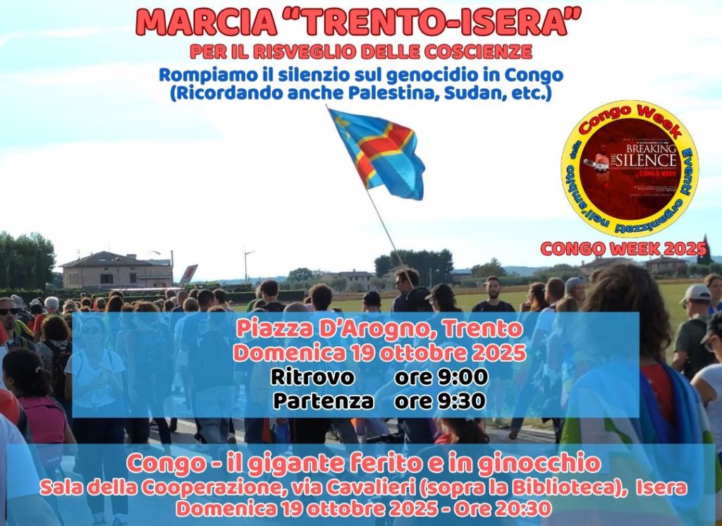La partenza è in programma da Trento, in piazza Adamo d’Arogno, alle ore 9,30. I partecipanti prenderanno la strada diretti ad Isera. Nel paese della destra Adige, la sera, alle ore 20,30 nella sala della Cooperazione, in via Cavalieri, sono previsti diversi interventi: John Mpaliza, portavoce della rete “Insieme per la pace in Congo”, Mario Cossali, presidente provinciale dell’Anpi (l’associazione dei partigiani), il cantautore Tommaso Carturan, fondatore di Arte migrante, Annalisa Garniga, assessora alla cultura del Comune di Isera.