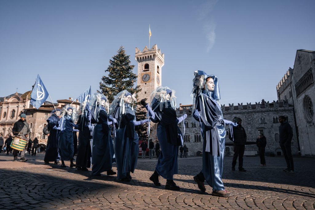 Lenta come l’agonia dei nostri ghiacciai in ritirata, si è conclusa in piazza Duomo, a Trento, la danza delle Blue Rebels di Extinction Rebellion che, accasciate a terra ai piedi della fontana del Nettuno, hanno voluto in questo modo sensibilizzare la cittadinanza sulla situazione dei ghiacciai prossimi all’estinzione o già estinti. Una protesta-performance che ha visto le figure vestite di blu, accompagnate da tamburi, portare al collo cartelli con nomi di ghiacciai prossimi all’estinzione o già estinti: “Cima Valbona: estinto”, “Fradusta: 2030”, “Careser: 2045”, “Adamello: 2080”.