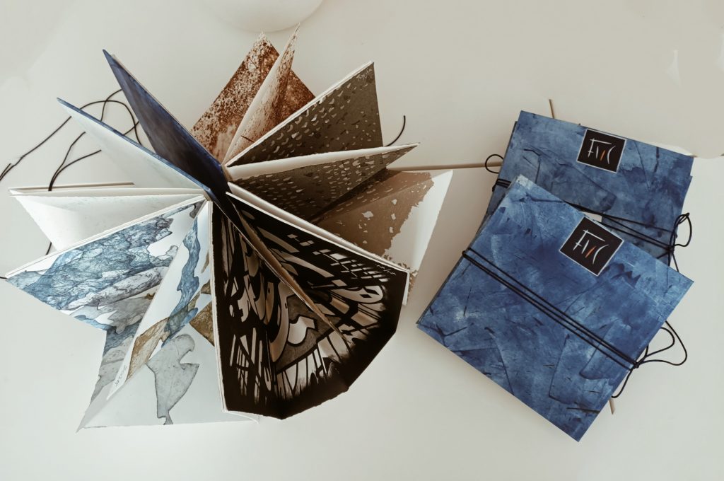 Ogni artista ha inciso la propria opera su carta bianca Cansons 250 g, creando un’immagine che rappresenta idealmente un personaggio: una voce, un frammento di linguaggio visivo che ap-partiene al suo autore. L’opera è stata poi piegata, dando così origine a sfaccettature inedite che pongono l’opera originale in una prospettiva nuova, cambiandone la lettura e dando sfumature ina-spettate a quell’ideale personaggio primordiale. Ogni opera-personaggio è stata infine messa in dialogo diretto e improvvisato con le altre, creando un vero e proprio canovaccio di stampe d’arte che saprà raccontare infinite storie grazie alle diverse prospettive in cui può essere letta l’opera. L’incontro tra le diverse stampe che cambia a seconda dell’ordine, della piegatura e della luce con cui viene sfogliato, crea una sorta di dialogo improvvisato e corale tra opere e artisti, proprio come accade sulla scena teatrale, dove il testo scritto si rinnova ogni volta nell’interpretazione degli attori.