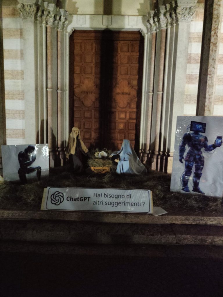 L’originale presepio allestito davanti alla chiesa del Santissimo in corso Tre Novembre a Trento suggerisce quest’anno il confronto fra la speranza cristiana della notte di Betlemme con la speranza “tecnologica” data oggi dalle potenzialità dell’intelligenza artificiale. Ecco quanto scrivono i curatori dell’Associazione Oratori Santissimo e Sposalizio a commento del presepe che presenta le sagome di due umanoidi ed è introdotto dall’offerta tipica di Chapt Gpt: “Hai bisogno di altri suggerimenti?”.