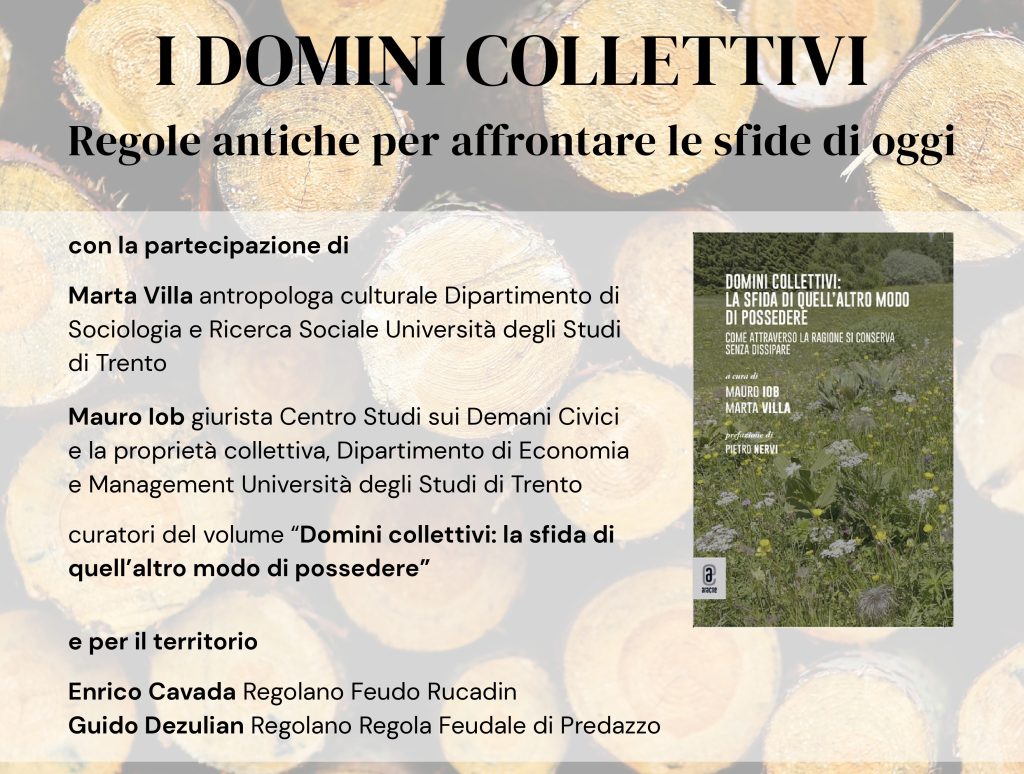 Protagonisti della serata saranno Marta Villa (antropologa) e Mauro Iob (giurista): due Professori dell’Università degli Studi di Trento, che da anni conducono i propri studi nell’ambito dei Domini Collettivi. Grazie al volume ‘Domini collettivi: la sfida di quell’altro modo di possedere‘, di cui sono curatori e in parte anche autori, scopriremo aspetti poco noti di queste forme di proprietà collettiva.