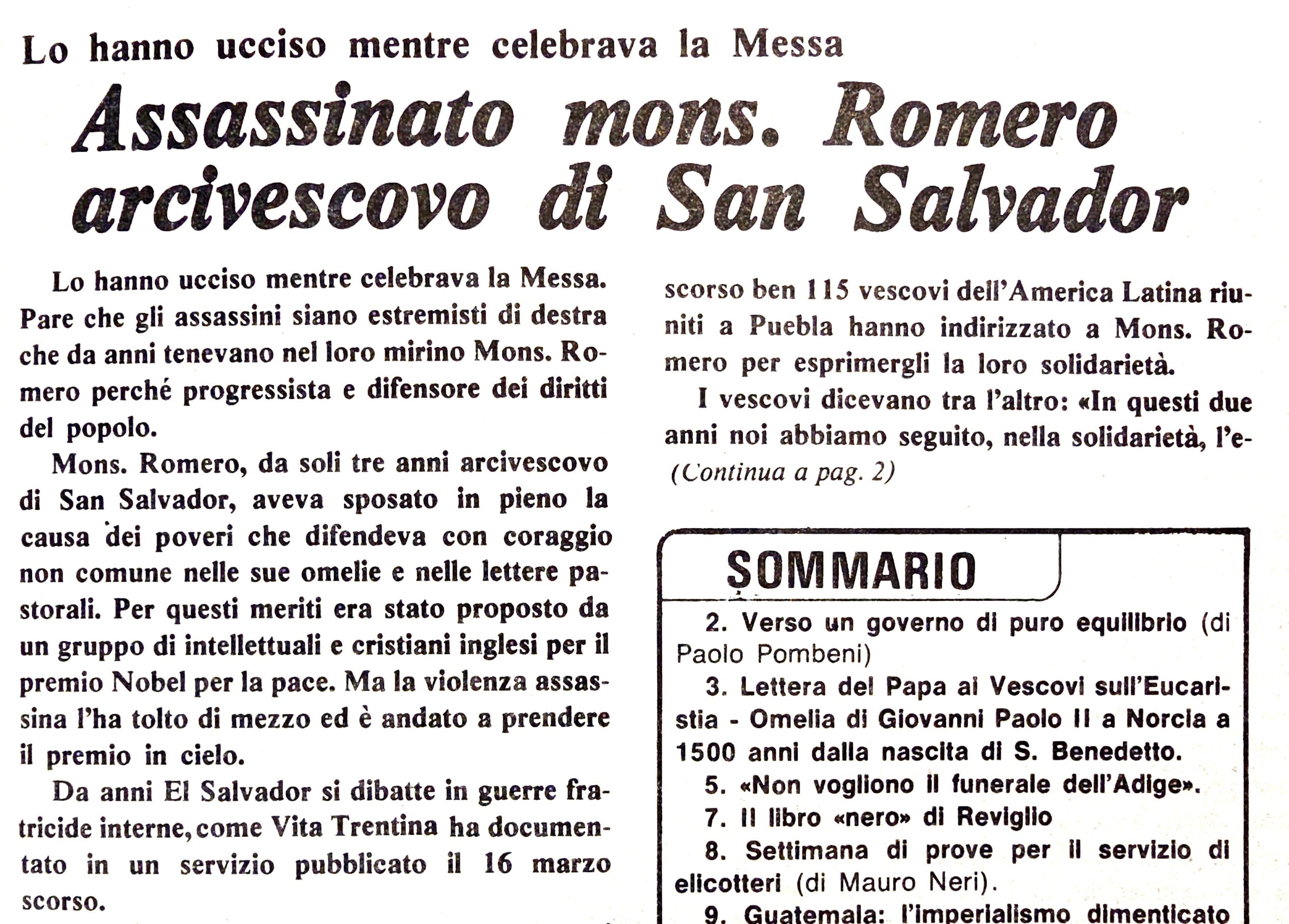 Il 23 marzo, infatti, nella cattedrale di San Salvador Romero si era rivolto a tutto il suo popolo, civile e militare con parole forti e chiare: “Soldati – aveva detto fra l’altro – vi supplico, vi prego, vi ordino, non uccidete i vostri fratelli”. Romero rifletteva da cittadino e sacerdote sul fatto che, da Caino in poi, ogni omicidio è un fratricidio.