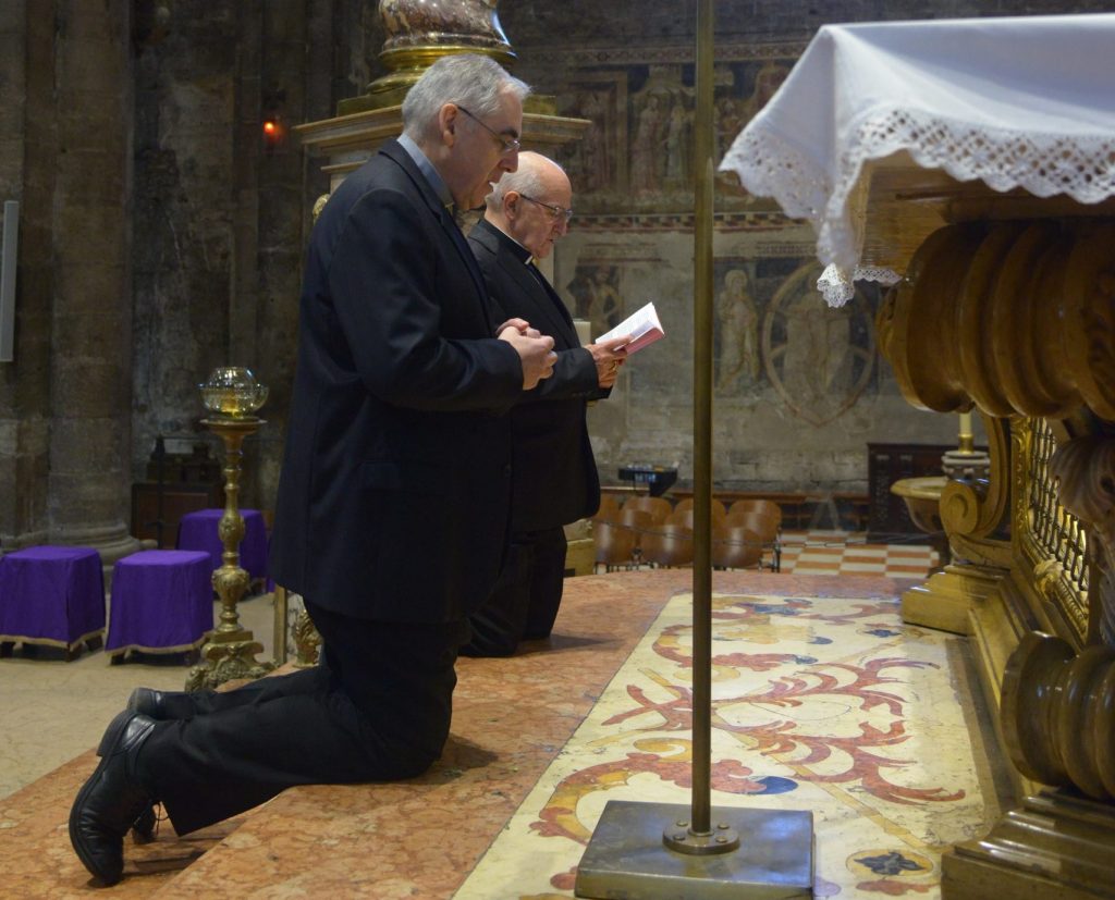 Era il Mercoledì delle Ceneri, il 10 febbraio 2016, quando a Roma come al Centro “Clesio” di Trento veniva annunciato il nome del 122° successore di San Vigilio alla guida dell’Arcidiocesi di Trento. Non è oggi il momento delle analisi retrospettive o degli encomi, che mons. Lauro Tisi rifugge con decisione, ma affidiamo un ricordo – poco noto, probabilment,e ma ricco di significato – a questa foto di Gianni Zotta. Dopo le prime parole ai cronisti trentini (“Mai avrei immaginato di diventare Vescovo, guardo avanti con speranza perché la Chiesa non è sulle spalle di don Lauro ma del Risorto”) e l’incoraggiamento dell’arcivescovo Luigi Bressan (“Accompagniamolo con la preghiera”), alle due del pomeriggio ci fu un gesto d’intesa profonda estemporaneo, ma molto eloquente: l’ex vicario generale e l’Arcivescovo emerito si recarono “quasi di nascosto” in Cattedrale e si raccolsero per una silenziosa preghiera, in ginocchio, davanti all’altare di San Vigilio. Loro due soli, “sulla roccia dell’antica fede trentina per ridirsi e forse anche per ricordarci – scrisse Vita Trentina – che quanto veramente conta è il mistero del Dio fatto uomo, a rinnovare il mondo”.
