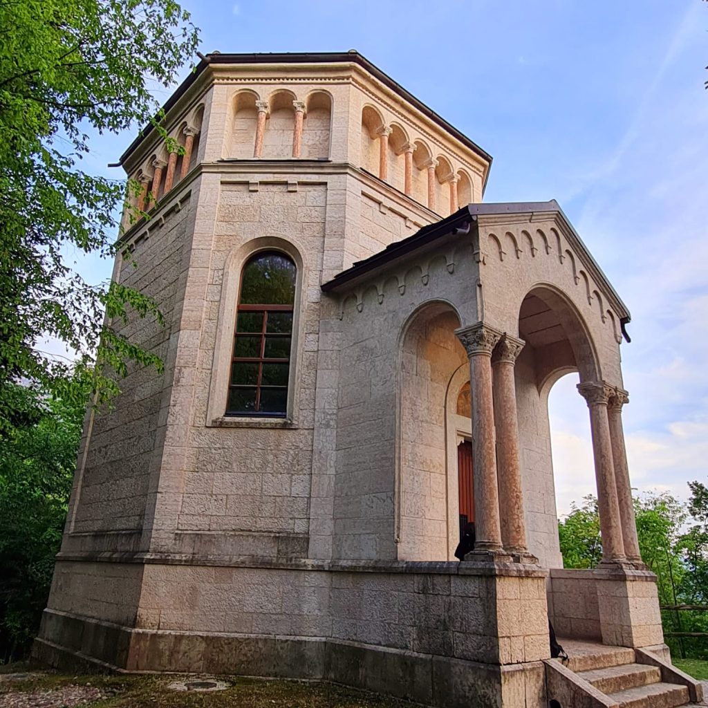 La Cappella di Sant’Adalberto fu fatta costruire dall’avvocato trentino Pietro Bernardelli, in memoria dell’amato nipote Adalberto, scomparso prematuramente all’età di sedici anni. Colto avvocato e deputato al Parlamento di Vienna, Bernardelli ereditò dal padre l’intero podere e il parco e ne volle impreziosire l’interno con la realizzazione della Cappella, edificata tuttavia solo nel 1872, alcuni anni dopo la morte del committente. Il progetto architettonico fu affidato all’ingegnere Francesco Saverio Tamanini, mentre per la pala d’altare venne coinvolto uno dei più noti pittori dell’epoca, Eugenio Prati.