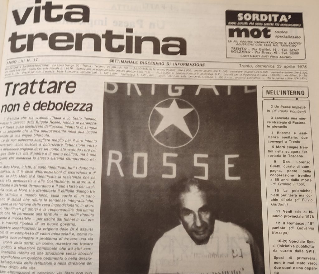 Così Vita Trentina descriveva il rapimento di Aldo Moro il 23 aprile 1978, ad una settimana dall’imboscata tesa dai membri delle Brigate Rosse, avvenuta il 16 marzo in via Mario Fani a Roma.