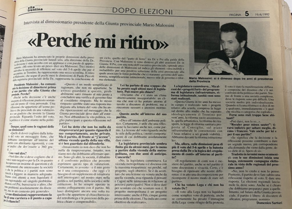 “Nella mia decisione c’è anche una parte di riflessione piuttosto sostanziale dal punto di vista personale. Una riflessione che appartiene all’uomo politico e che prescinde da una valutazione e un giudizio che investe la Giunta Provinciale. Riguarda l’esito del voto, la politica e il come stiamo nella politica”. A parlare è Mario Malossini, nel numero di Vita Trentina del 19 aprile 1992, che riporta l’intervista all’ex presidente della Giunta provinciale di Trento, con le motivazioni dell’annunciato ritiro e l’invito alla riflessione lanciato alla DC.