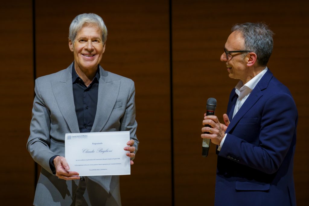 All’Auditorium del Conservatorio Bonporti, accolto da un benvenuto musicale offerto dagli studenti stessi, Baglioni ha aperto un dialogo autentico e senza filtri sulla musica e sul mestiere dell’artista. Condotto dal dirigente scolastico Calogero Di Liberto, l’incontro ha ripercorso le tappe più significative di una carriera lunga sessant’anni, esplorando temi come l’autenticità, lo studio rigoroso, la ricerca e la capacità di restare in ascolto del presente. A sorpresa il direttore Di Liberto ha comunicato che il Conservatorio riconoscerà a Claudio Baglioni il diploma di secondo livello honoris causa.