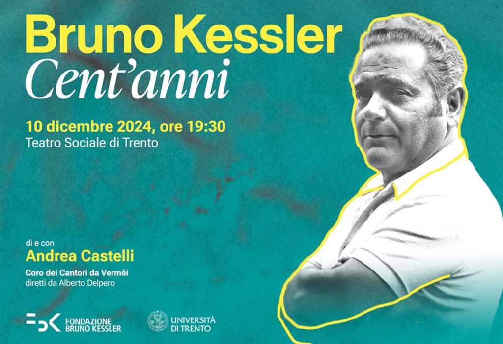 Il centenario della nascita di Bruno Kessler, avvocato, politico e soprattutto uomo di grandi intuizioni e forte determinazione, nato nel 1924 a Cogolo di Pejo, sarà celebrato anche con uno spettacolo teatrale dal titolo “Bruno Kessler. Cent’anni”, ideato dalla Fondazione Bruno Kessler e dall’Università di Trento che andrà in scena martedì 10 dicembre alle 19.30 al Teatro Sociale di Trento.