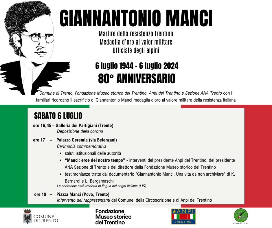 Nel giorno dell’80° anniversario del suo assassinio, sabato 6 luglio a Trento si svolgeranno le celebrazioni per commemorare Giannantonio Manci, martire della Resistenza trentina e medaglia d’oro al valor militare, alle quali presenzieranno il Comune, la Fondazione Museo storico del Trentino, Anpi del Trentino, la sezione Ana Trento con i familiari. Le celebrazioni inizieranno alle […]