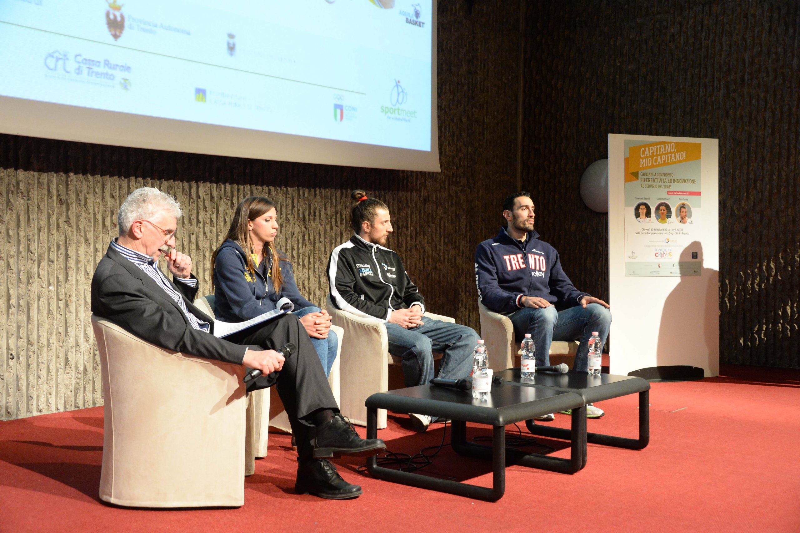 I capitani di Trentino Volley, Trentino Rosa e Aquila Basket sono stati protagonisti di "Capitano, mio capitano!”, un confronto “su creatività ed innovazione al servizio del team" guidato dal medico sportivo Paolo Crepaz, giornalista e presidente della “Fondazione per Sophia”. "Essere capitano è un privilegio, un ruolo di cui essere orgogliosi – ha esordito Birarelli, capitano anche della Nazionale italiana di pallavolo -, al tempo stesso implica delle responsabilità: bisogna mettere da parte egoismi e ambizioni personali e agire nell'interesse della squadra, perché il gruppo viene sempre prima dell'individuo". Gli ha fatto eco Forray: "La leadership trova la sua espressione nella capacità di contagiare tutti i membri della squadra con il proprio esempio, la voglia di allenarsi e la disponibilità al sacrificio". "Essere prescelta dalla società per rivestire questo ruolo – ha confidato Marchioron – mi ha aiutato a maturare: so che nelle situazioni di difficoltà devo dominare le emozioni e non posso permettermi di mollare". Più volte dall'inizio del campionato, il primo della Delta Informatica in A2, l'opposta gialloblù è stata best scorer, dimostrando che il gioco espresso in partita è frutto del lavoro svolto in palestra durante gli allenamenti settimanali, come poi hanno sottolineato anche Forray e Birarelli nel corso dell'incontro seguito da un folto pubblico e promosso in collaborazione con CONI, Cooperazione Trentina e Cassa Rurale di Trento.