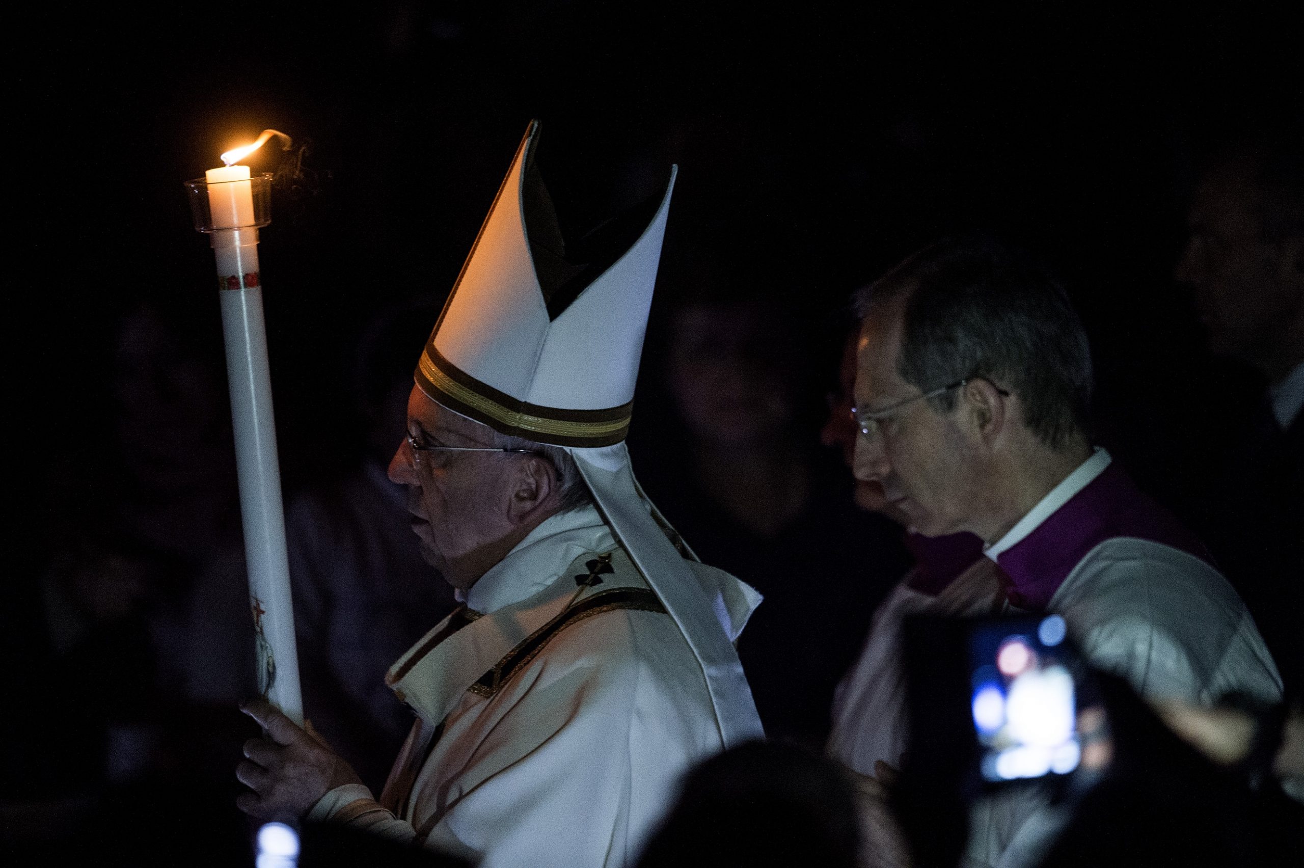 A fronte di questa novità, piccola ma non piccola, la diretta televisiva dalla Basilica Vaticana ha mostrato nella liturgia della luce alcuni segni su cui vale la pena riflettere. Da un lato la cura del buio, rotto solo da una scia di luci a terra, inevitabili probabilmente per la sicurezza e per le riprese. Dall'altra l'avanzare del cero seguito dalle candele accese dei vescovi, che non propaga la sua fiamma all'assemblea e, tuttavia, l'assemblea luccicava di fiammelle, anche là dove il cero non era ancora arrivato. Ci ho messo un po' a capire che si trattava di telefonini e smartphone con cui la gente riprendeva la processione.