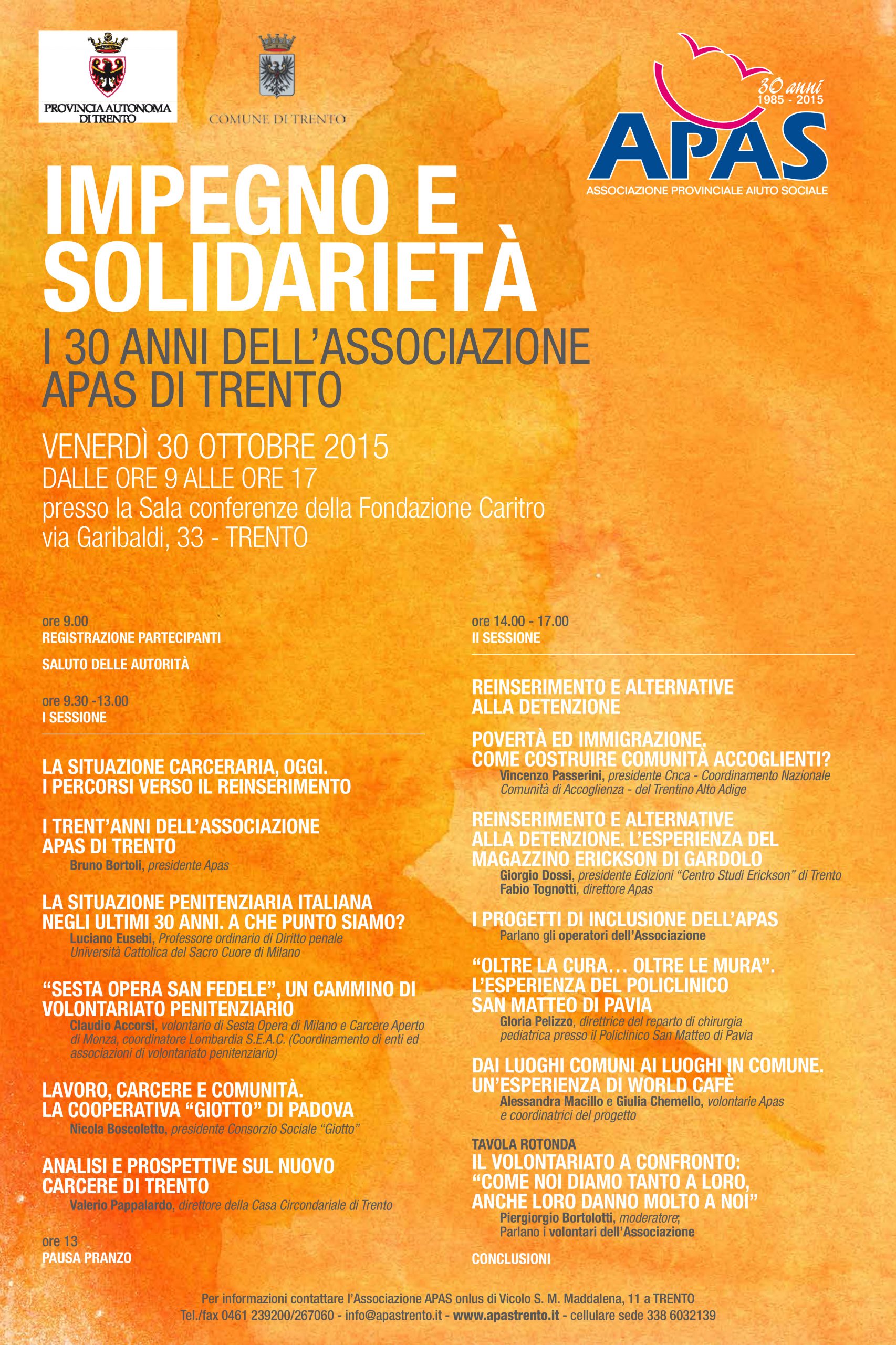 L'Apas – Associazione provinciale di aiuto sociale per i detenuti, gli ex detenuti e i loro famigliari – festeggia quest’anno i 30 anni di attività. L’associazione è sorta infatti nel 1985 per iniziativa di alcune persone particolarmente disponibili – volontari, assistenti sociali e avvocati -, che a vario titolo si occupavano di persone che entravano nel circuito penale. Da allora l’associazione interviene a sostegno di persone – italiani o cittadini comunitari o extracomunitari – che hanno problemi con la giustizia. Nella gran parte dei casi sono detenuti presso la Casa Circondariale di Trento o presso altri Istituti di pena, pur mantenendo un significativo legame con il territorio provinciale.