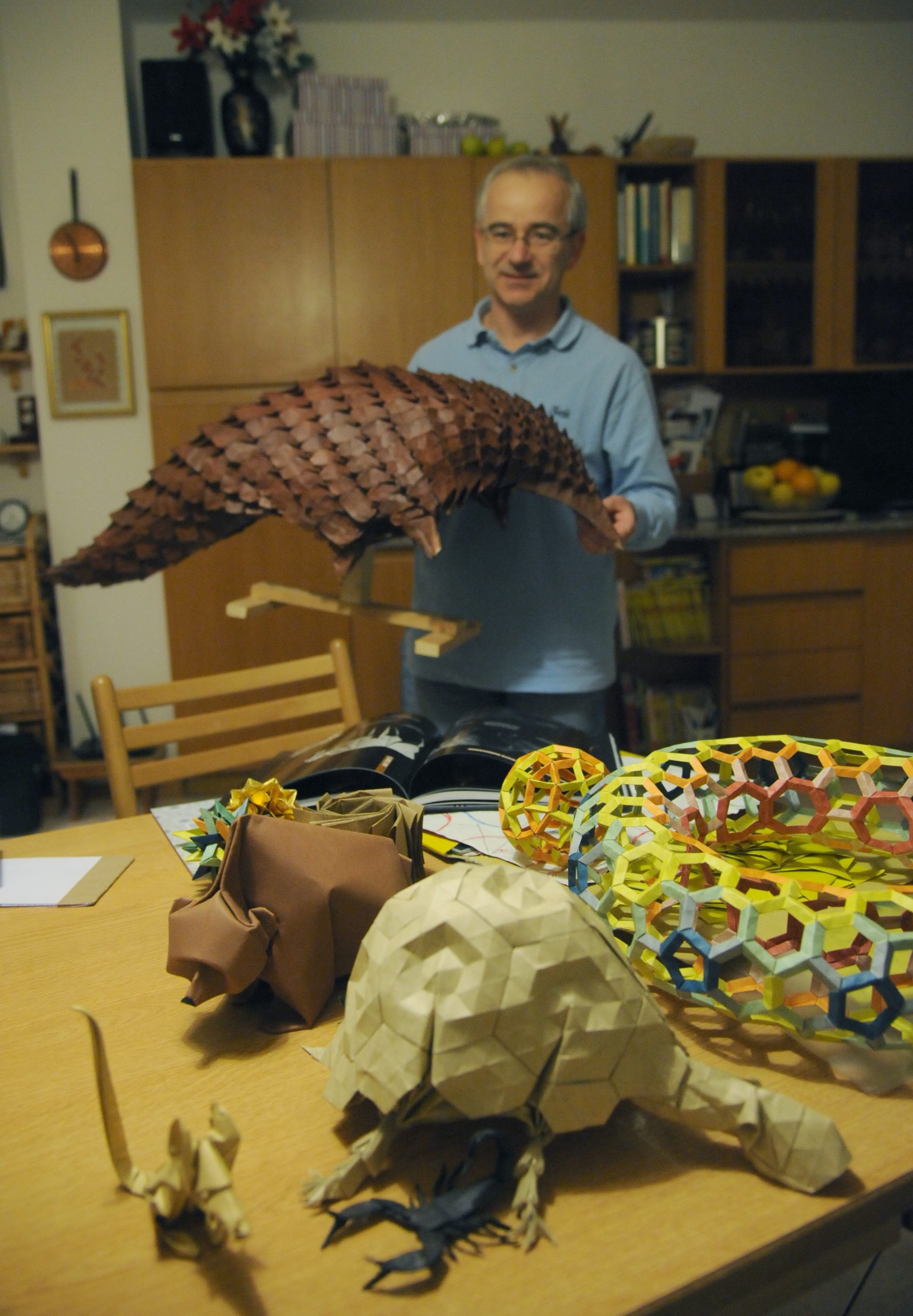 Roberto emoziona e stupisce, lui stesso ancora stupìto di quanto un semplice foglio di carta possa regalarci, piega dopo piega. Vive quest’arte povera senza forzature e narcisismi, piuttosto preoccupato di sottolineare gli stimoli che ne derivano alla fantasia, manualità e creatività. Alcuni eventi dell’associazione nazionale sono dedicati all’origami nella didattica, si sono tenuti corsi e laboratori nelle scuole trentine. Qualche sperimentazione è stata avviata per imparare la geometria (con l’origami si può dividere un angolo in tre parti uguali), per favorirel’apprendimento dei dislessici, per comunicare con i soggetti autistici. Il giorno dopo Gretter ci ha lasciato visitare il suo laboratorio (il salotto di casa) a Pergine, dove vive con la moglie Rosanna e i tre figli. Con un semplice movimento della dita abbiamo visto distendersi e poi ripiegarsi una rosa: “La carta ricorda”, ripete Roberto nel constatare che la carta ritorna al suo posto iniziale. Ma quanto può costare quest’allegra tartaruga di carta? Non ha prezzo, perchè l’associazione degli origamisti vive senza scopo di lucro. Quest’arte è un ambito ancora preservato dal consumismo: sa piegare quasi tutto, ma non si piega al mercato.Non si usano forbici e colla, gli strumenti principali sono due e le possiede ognuno di noi: hanno cinque dita. Certo, per diventare un origamista esperto e affermato, invitato nei convegni mondiali (Roberto è stato invitato a New York, in Spagna, Germania e Svizzera) ci vuole anche un’inventiva formidabile, come quella che ad un concorso sul tema dell’acqua lo ha portato a inventarsi una grande goccia…di carta catturata nell’attimo in cui rimbalza sull’acqua generando onde concentriche.Nel prossimo week end si tiene il convegno annuale degli origamisti in Emilia Romagna e Roberto forse porterà anche questo numero cartaceo di Vita Trentina: chissà che dopo aver letto questa “terza pagina” non decida di trasformarla in un orsetto o in una rosa.