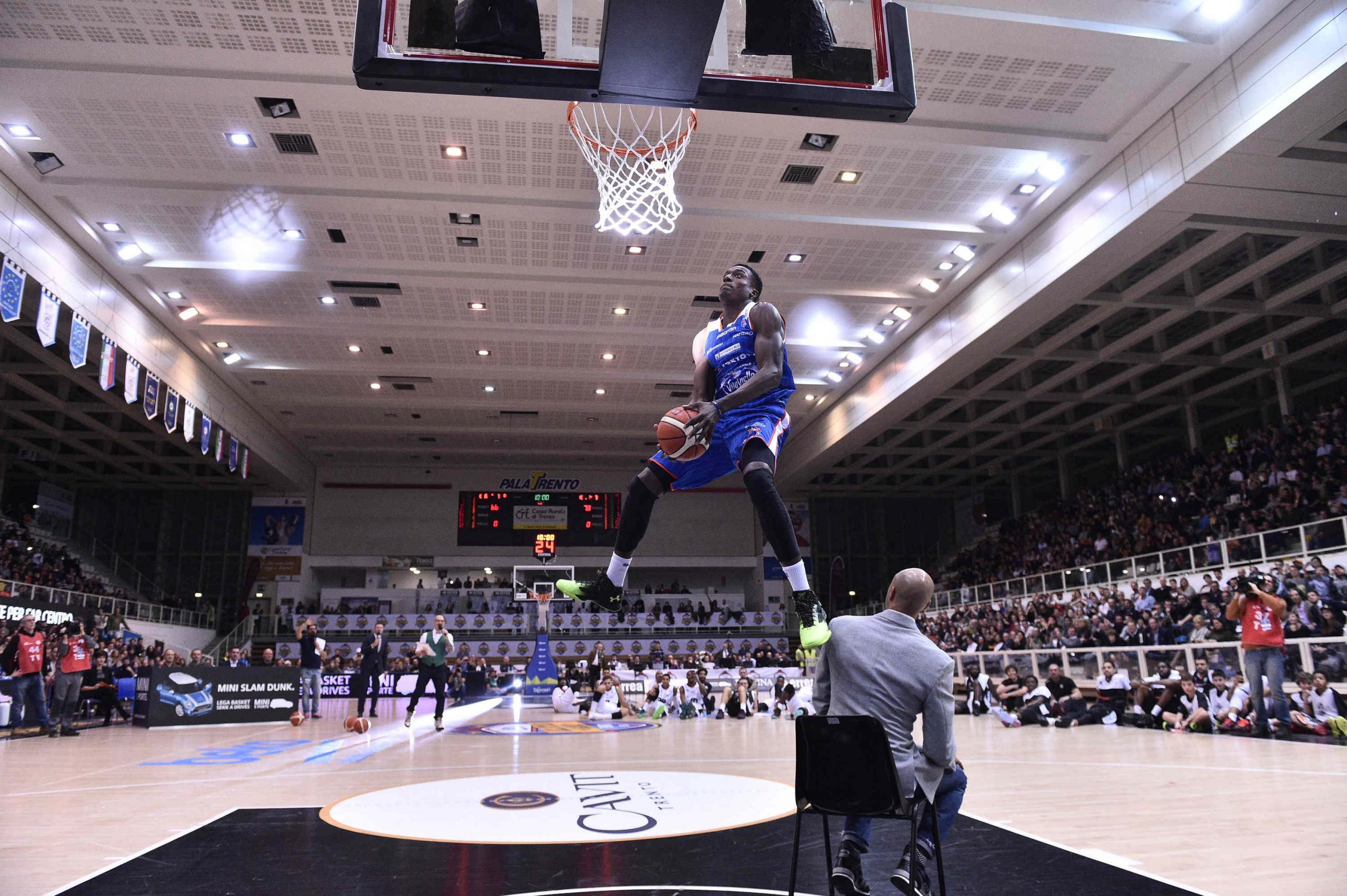 Lo abbiamo visto finalmente domenica a Trento, “una città che sta cambiando la geopolitica del basket italiano”, come ci ha testimoniato Dan Peterson, l’ottantenne coach sempre più uguale a se stesso e alla sua camminata nervosa a bordo campo, braccia conserte. L’esibizione – ben orchestrata dalla Federazione e da uno sponsor convinto – riesce ad accalappiare anche tifosi potenziali (meno “tecnici” e più spettacolari) che si godono un’inedita sfida fra i big del campionato, a parte qualche defezione, designati dal pubblico e soprattutto l’esecuzione nell’intervallo dei fondamentali più spettacolari: la raffica dei tiri da 3 punti (25 palloni in un minuto da cinque diverse posizioni) e le schiacciate acrobatiche. Un duello vero, vinto al Palatrento dal tiratore Simon Bramos per i cecchini e dal canturino Abass per l’invenzione del salto con palla sotto gamba e schiacciata devastante. Un torneo con tanto di giuria e regolarmente ferreo, in grado di esaltare la perfezione e anche la difficoltà del singolo gesto tecnico, spesso poco valorizzato nelle fasi concitate di una partita. Pubblico a bocca aperta, musica da circo, e i giocatori seduti a gambe incrociate ad ammirare i propri compagni selezionati per l’acrobazia più virtuosa e incredibile.