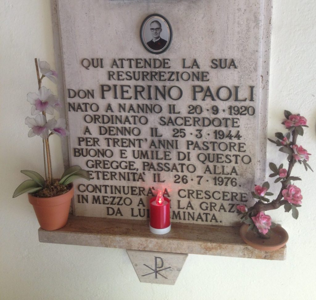 Nato a Nanno il 20 settembre del 1920, don Pierino veniva da una famiglia religiosa convinta e la sua formazione fu coltivata fino al seminario dal curato don Pio Zadra. Celebrò la Prima Messa nel 1944; nonostante il tempo di guerra, il paese fu abbellito, con bandierine e giovani conifere lungo le strade e nella piazza, dove dai coscritti fu eretto davanti all’antica chiesa di S. Biagio un arco con la scritta “Don Pierino novello ministro di Dio proteggi i tuoi cari e la tua Patria”.