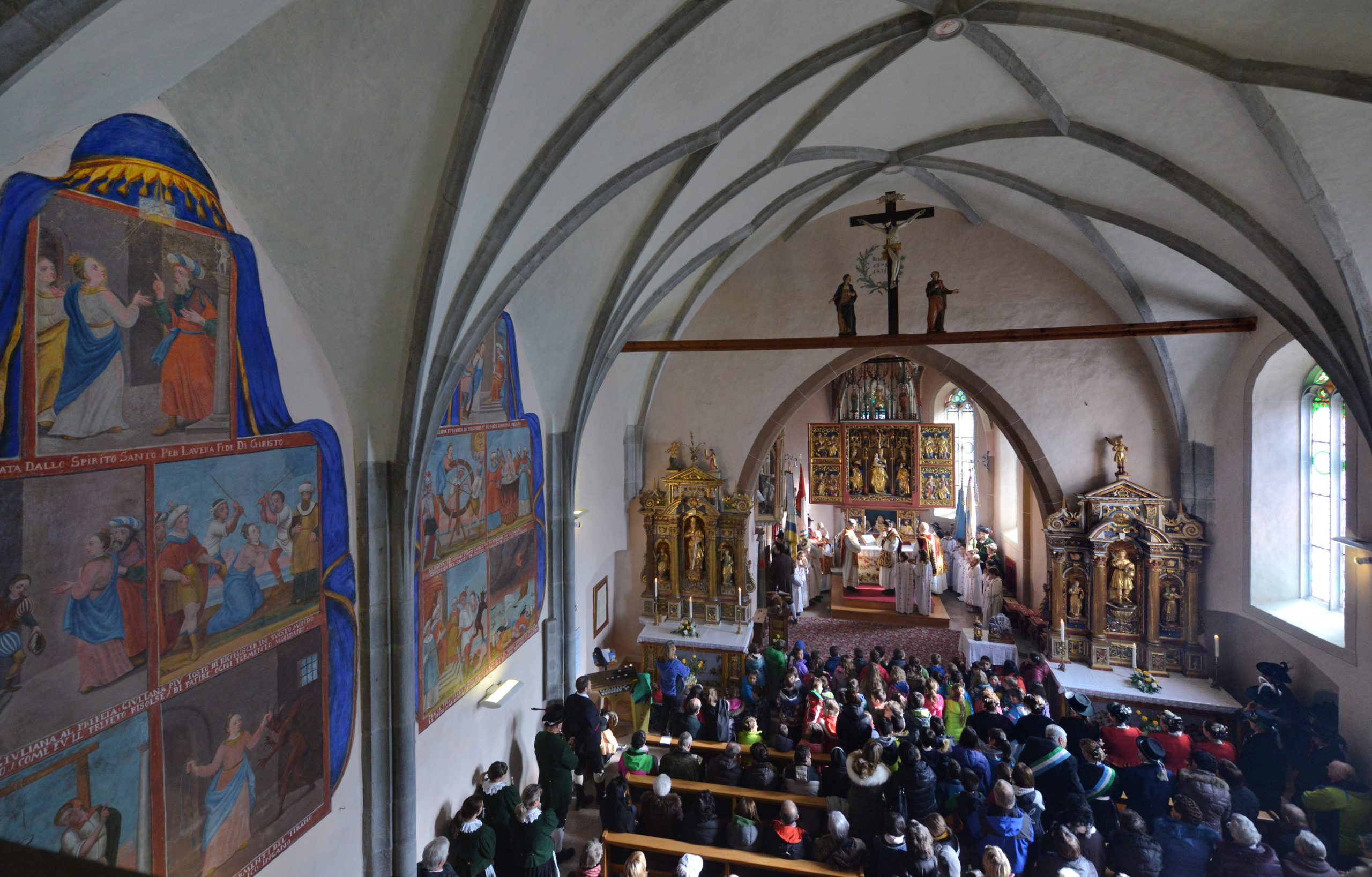 Tanti ne sono passati da quando lo scultore della bottega bolzanina Joerg Arzt concludeva questo capolavoro gotico – tra le più importanti sculture lignee delle chiese trentine – che oggi viene benedetto e incensato con la dovuta solennità. Dopo alterne vicende storiche e qualche manomissione si presenta infatti nel suo primitivo splendore grazie a interventi finiti nel 2009 ed ora completati con la collocazione dei busti di due profeti, realizzati dagli studenti del locale Liceo Artistico “Soraperra”. Un contributo dei giovani apprendisti scultori di oggi alla sapiente tradizione artistica del passato, un segno di continuità eseguito “a regola d'arte” come afferma la Sorastant della scuola fassana, Mirella Florian.