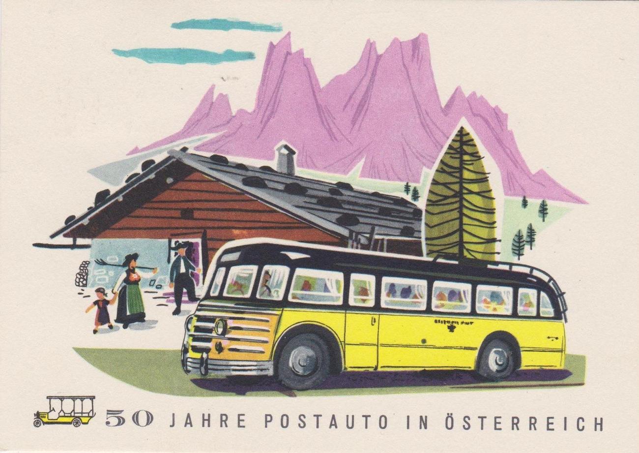 Fino al 1907 il tratto di strada veniva percorso con delle carrozze a cavalli. Da allora, ormai i tempi erano maturi, la linea fu modernizzata, e le carrozze furono sostituite da un regolare servizio di autocorriere, che oltre al servizio postale trasportava anche passeggeri. Nel 1957 a cinquant’anni di distanza, le Poste Austriache, hanno voluto ricordare l’avvenimento emettendo un francobollo da uno scellino raffigurante un’autocorriera moderna con a fianco, per confronto, quella usata cinquant’anni prima. Nella stessa occasione è stato usato un annullo di circostanza e un’apposita cartolina (1).