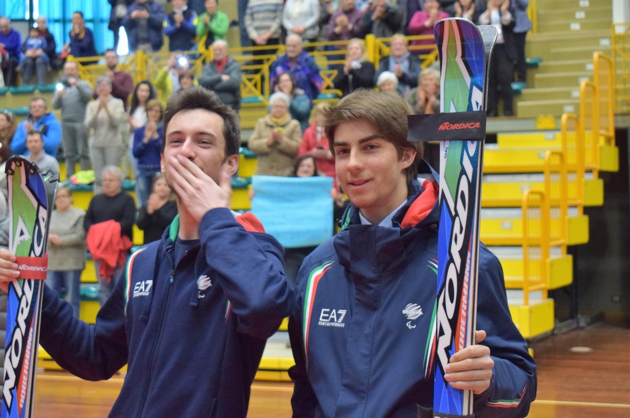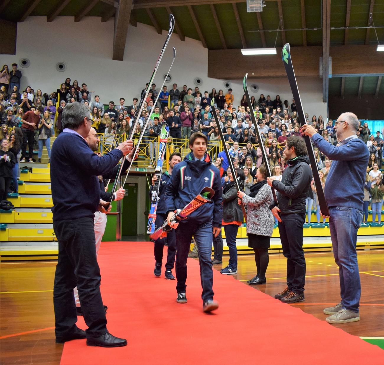 Giacomo Bertagnolli e Fabrizio Casal hanno fatto il loro ingresso mercoledì mattina nell’arena su un tappeto rosso delimitato dai docenti che, sci alla mano, hanno reso onore ai due atleti appena rientrati dai Giochi paralimpici di Pyeongchang dopo aver conquistato quattro delle cinque medaglie azzurre: due ori, un argento e un bronzo.