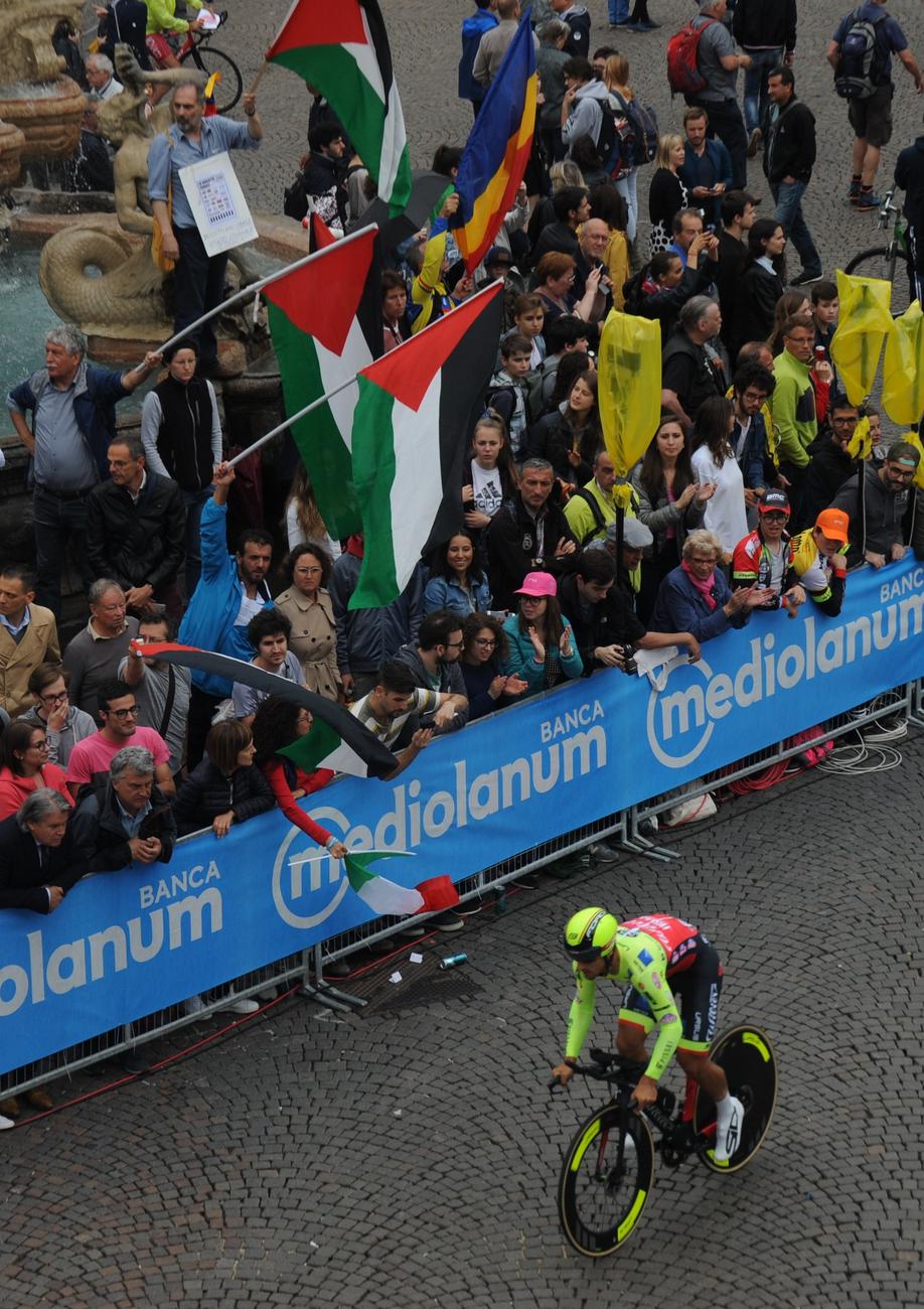 Nella festosa cornice di popolo che ha accompagnato la partenza della cronometro, lungo le transenne che portavano i corridori ad imboccare via Belenzani, era impossibile non notare le numerose bandiere palestinesi presenti. Un simbolo che, a pochi giorni dall’uccisione di 61 palestinesi, tra cui una bimba di soli 8 mesi, durante gli scontri di Gaza tra l’esercito israeliano ed i manifestanti, voleva contestare la scelta degli organizzatori del Giro di far partire la corsa rosa con le prime tre tappe proprio da Israele, legittimandone le politiche militari e distogliendo l’attenzione dalla tragedia del conflitto in corso da ormai troppo tempo.